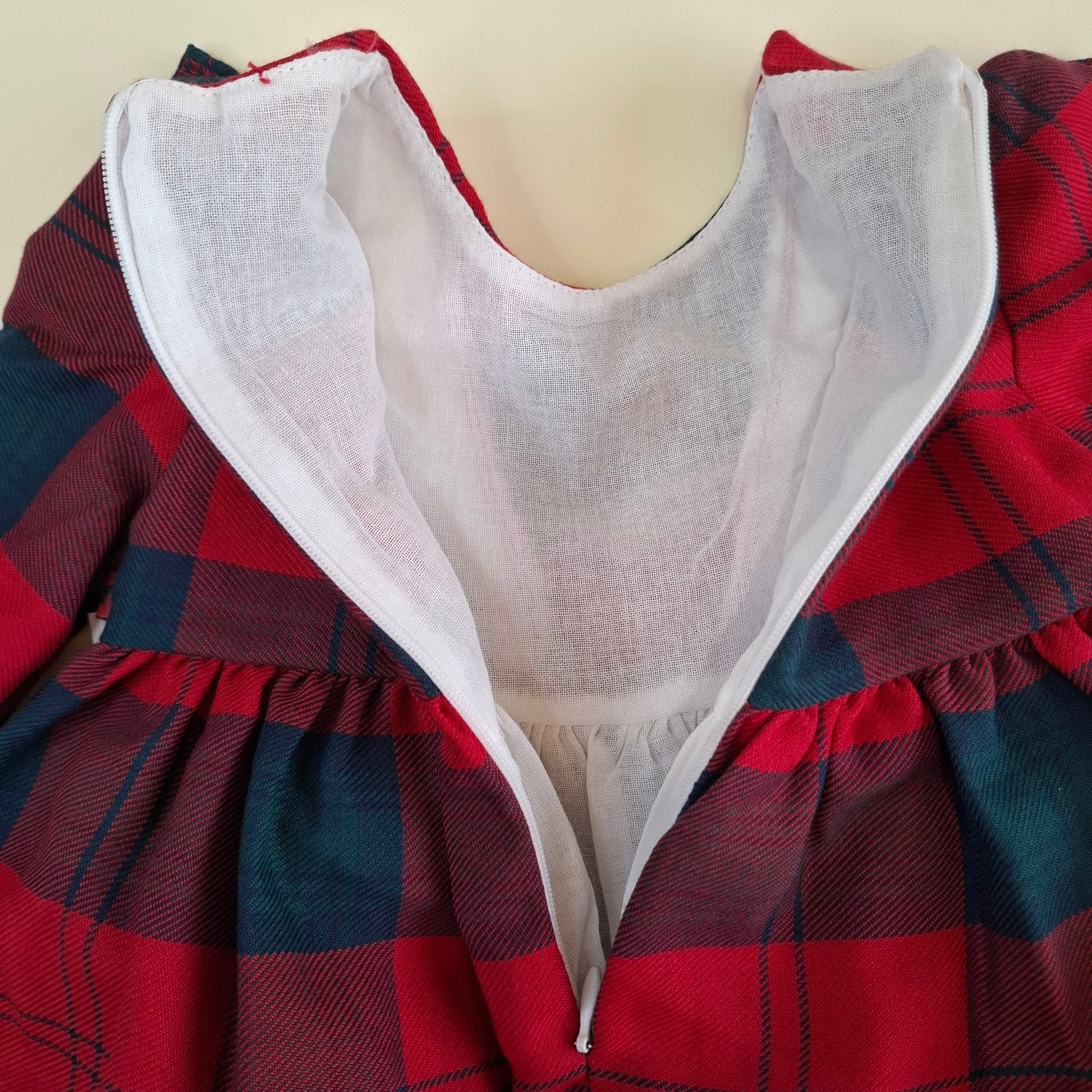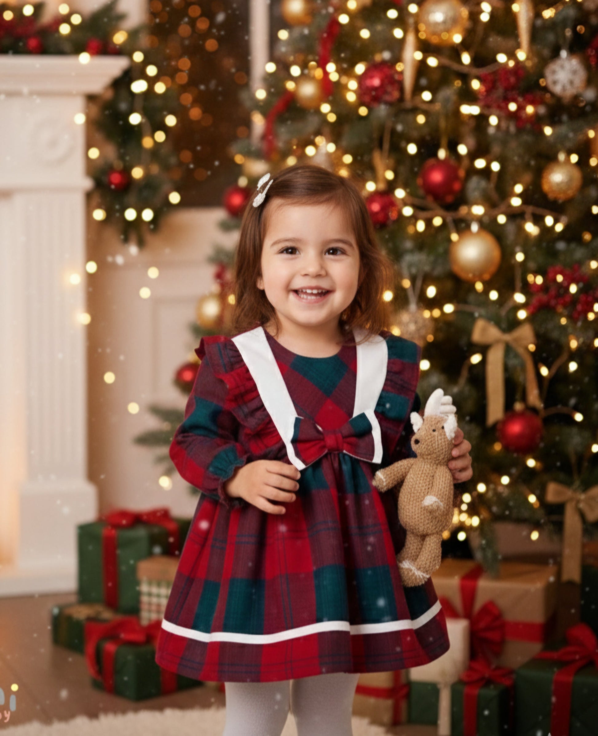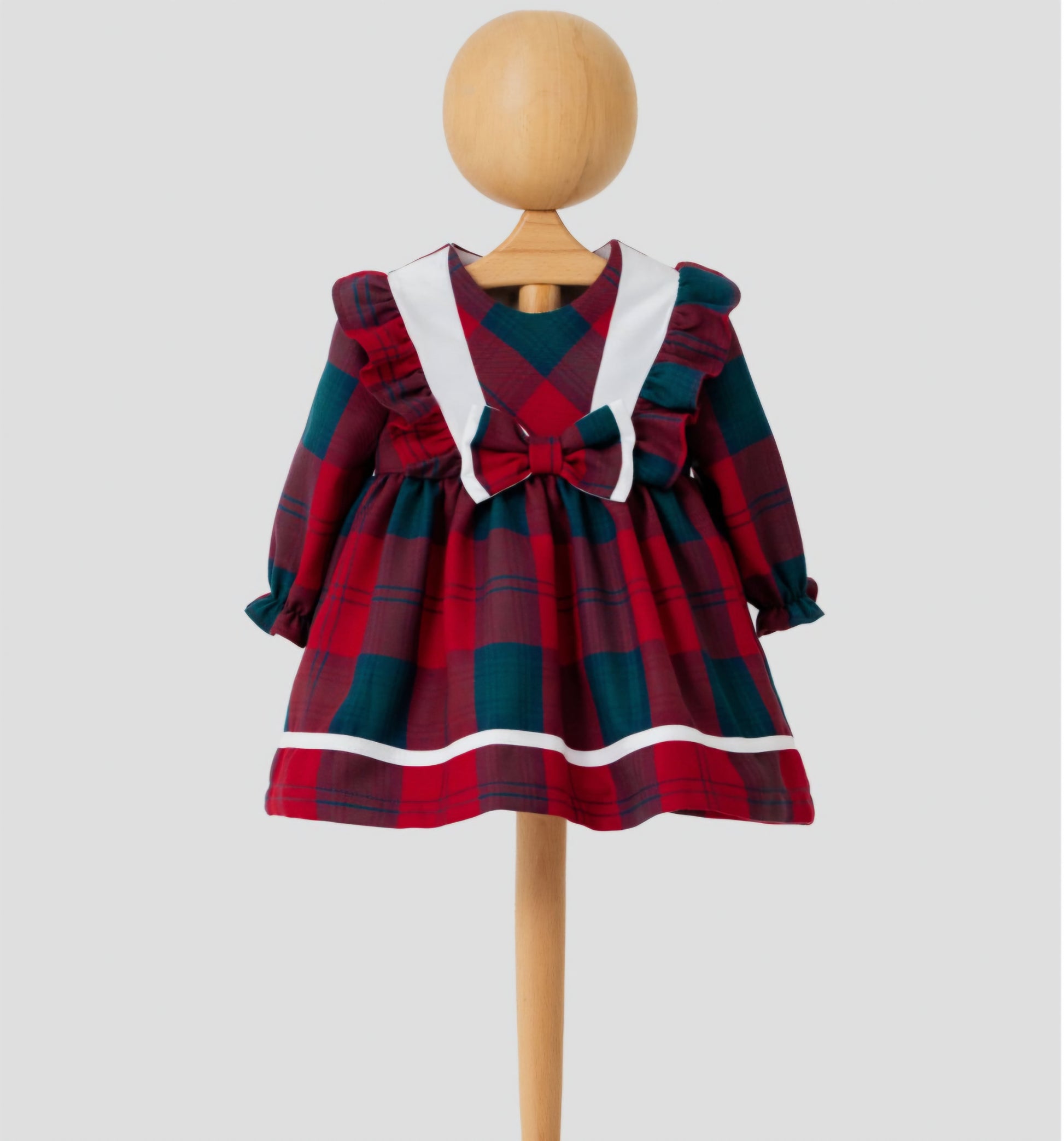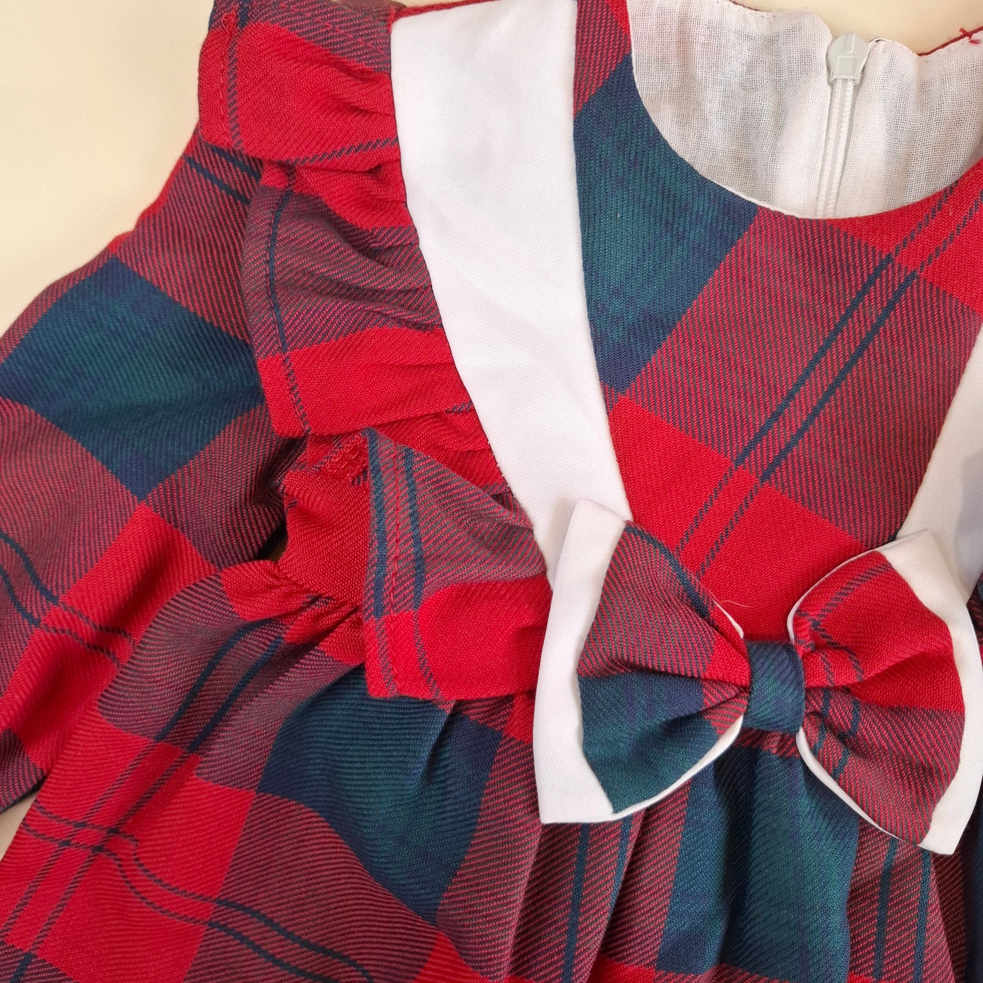 Karirana haljinica klasičnog prazničnog dizajna, izrađena sa pažnjom na svaki detalj. U gornjem delu nalazi se dekorativna mašnica, dok volani i kontrastne trake dodaju poseban, svečani izgled.