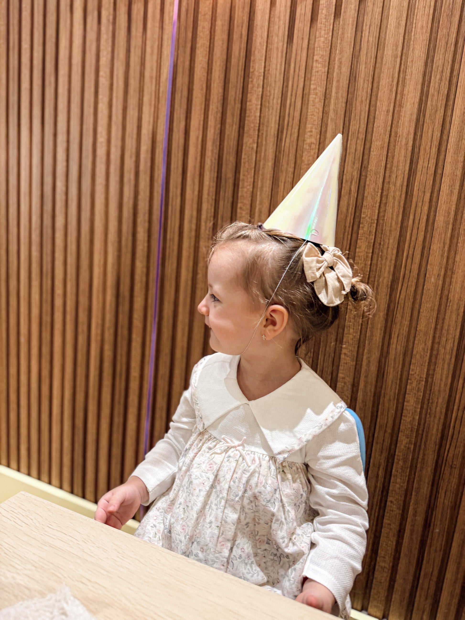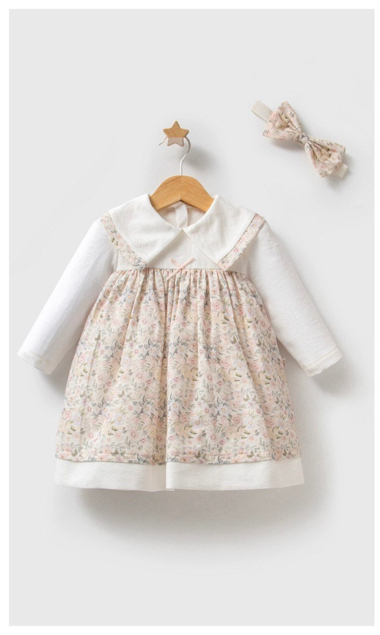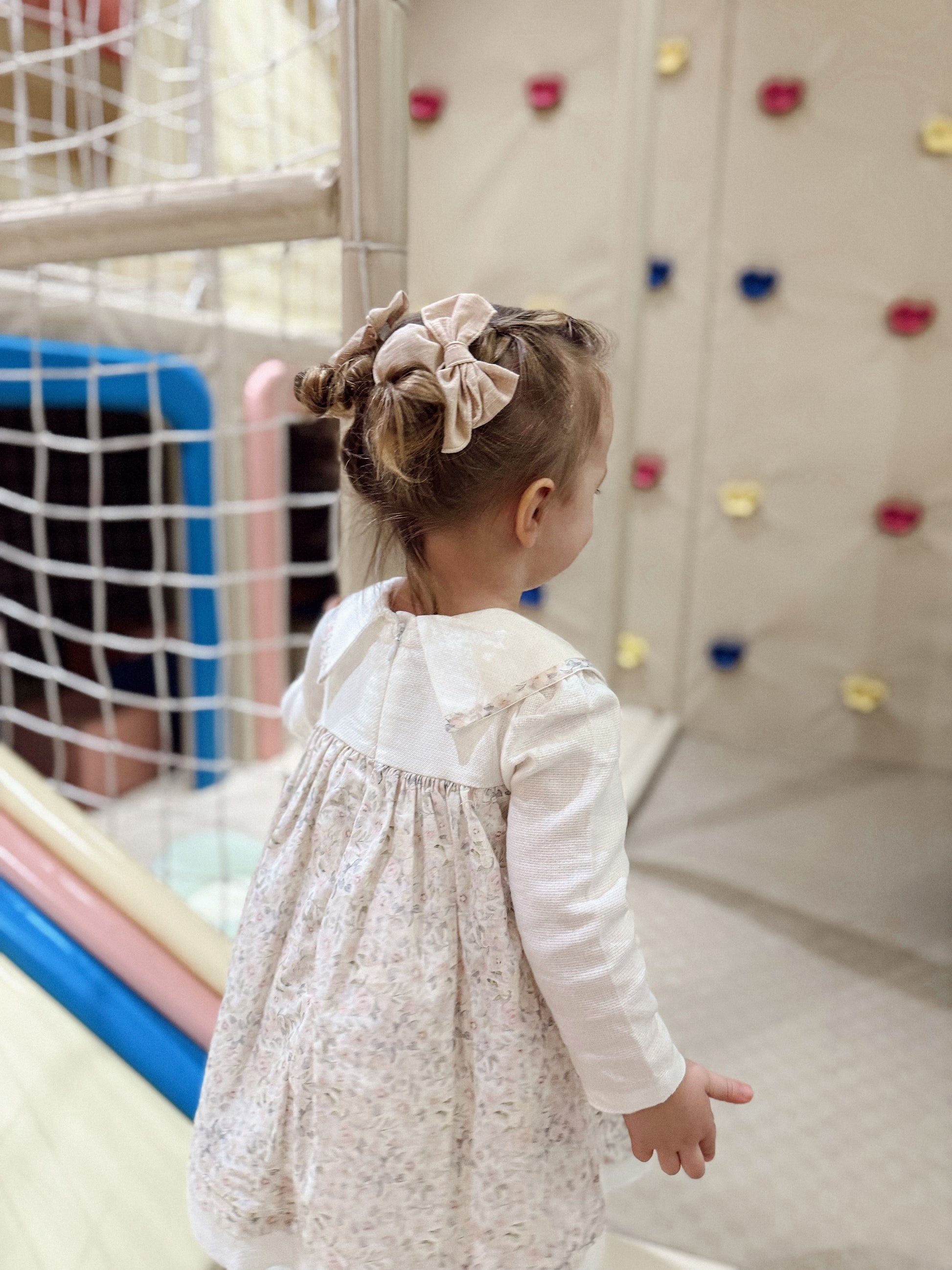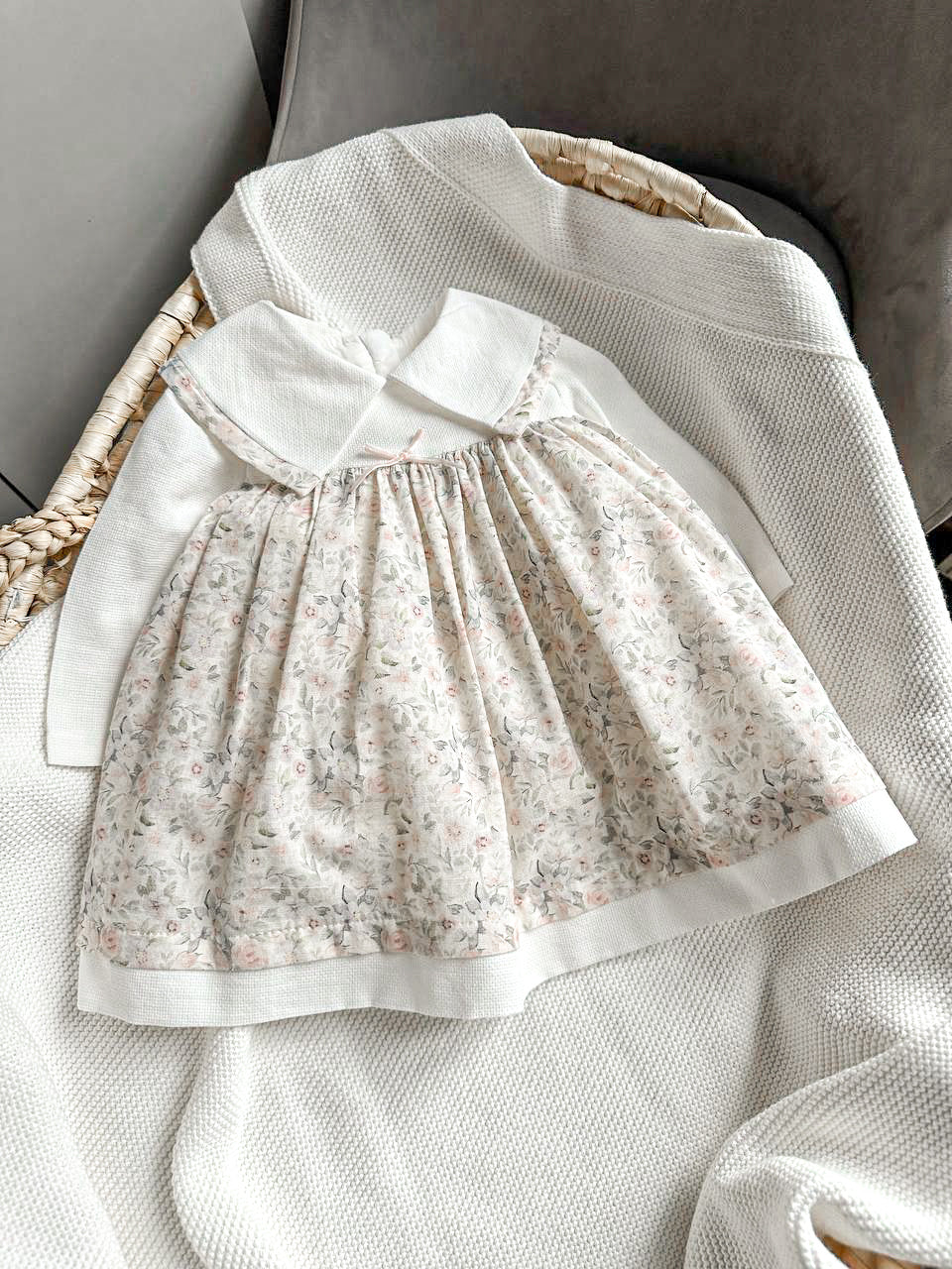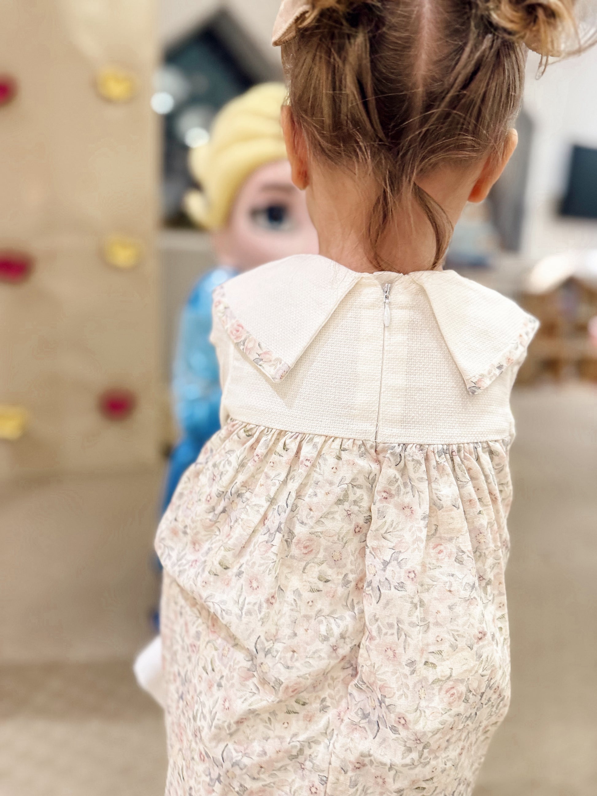 Gornji deo izrađen je od mekanog pamuka, dok je kragnica deo od lagane tkanine sa sitnim cvetnim dezenom koji unosi dozu šarma u svaku prolećnu kombinaciju, a ispod se nalazi sloj tila koji daje bajkoviti volumen. Za potpuni komfor u dodiru sa kožom bebe, unutrašnji sloj je od čistog pamuka.