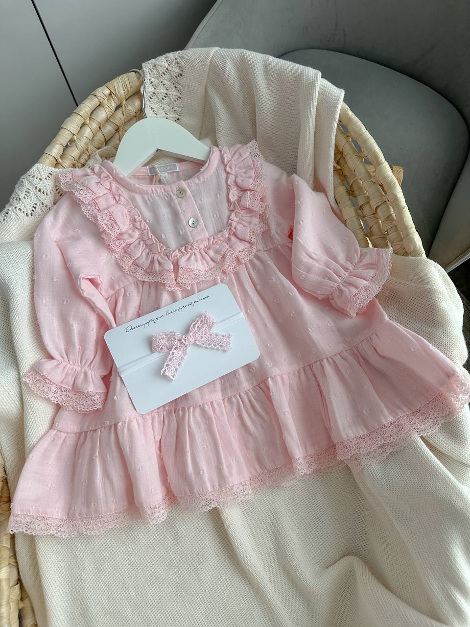 Elegantna haljinica sa čipkom i nežnim radom. Kopčanje dugmićima na leđima. Trakica ne ide u kompletu sa haljinicom. Odvojeno se uzimaju.