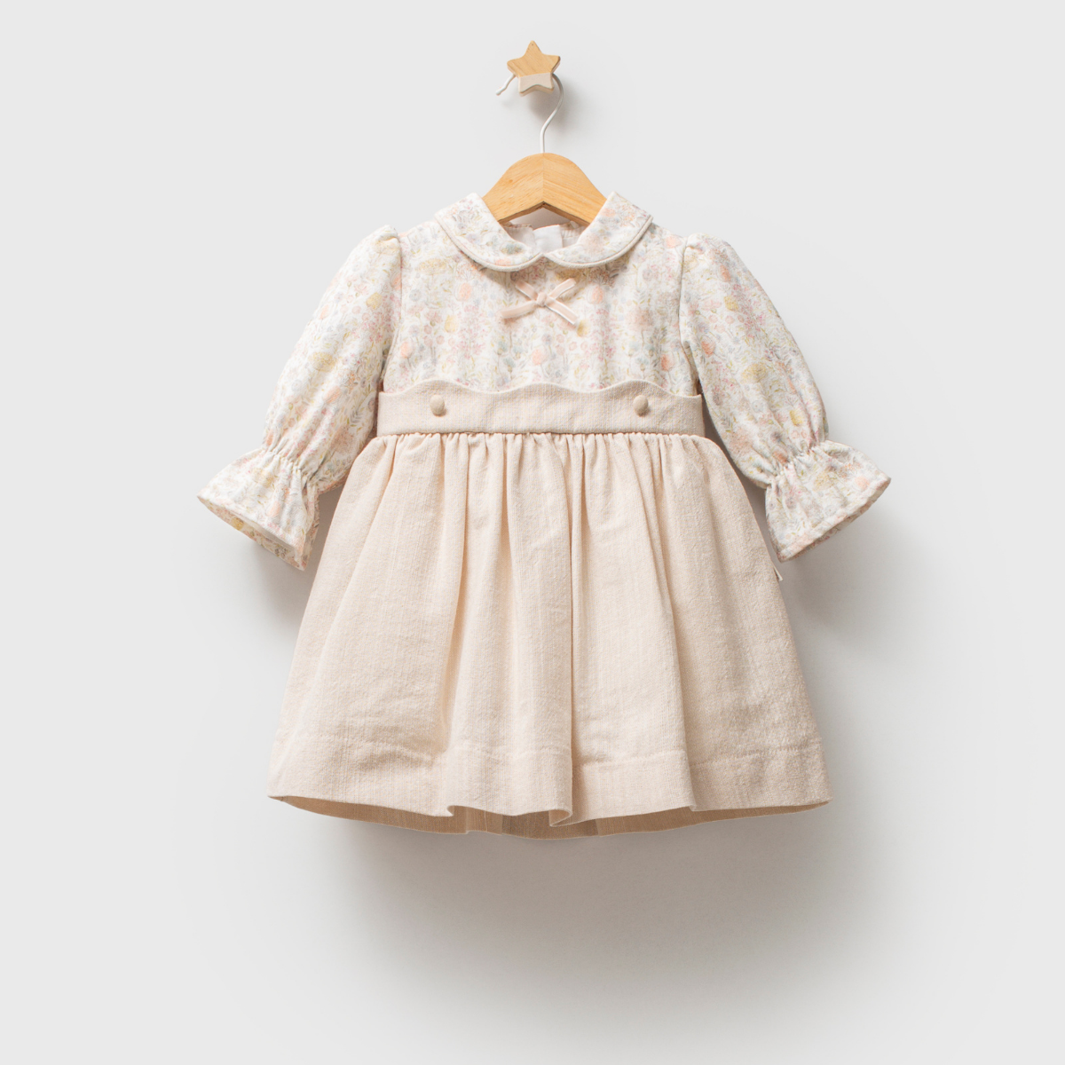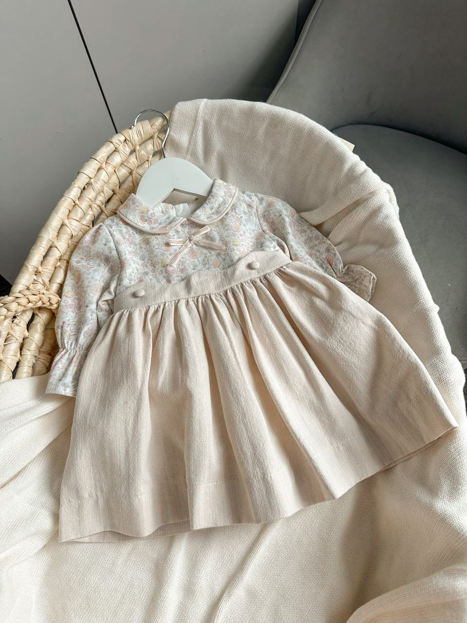 Haljinica spoj umetnosti i nežnosti – gornji deo izrađen je u umetničkom stilu od 100% mekog pamuka i ukrašen detaljem mašnice. Donji deo je od kvalitetnog, debljeg lana, a ispod se nalazi sloj tila koji daje bajkoviti volumen. Za potpuni komfor u dodiru sa kožom bebe, unutrašnji sloj je od čistog pamuka.