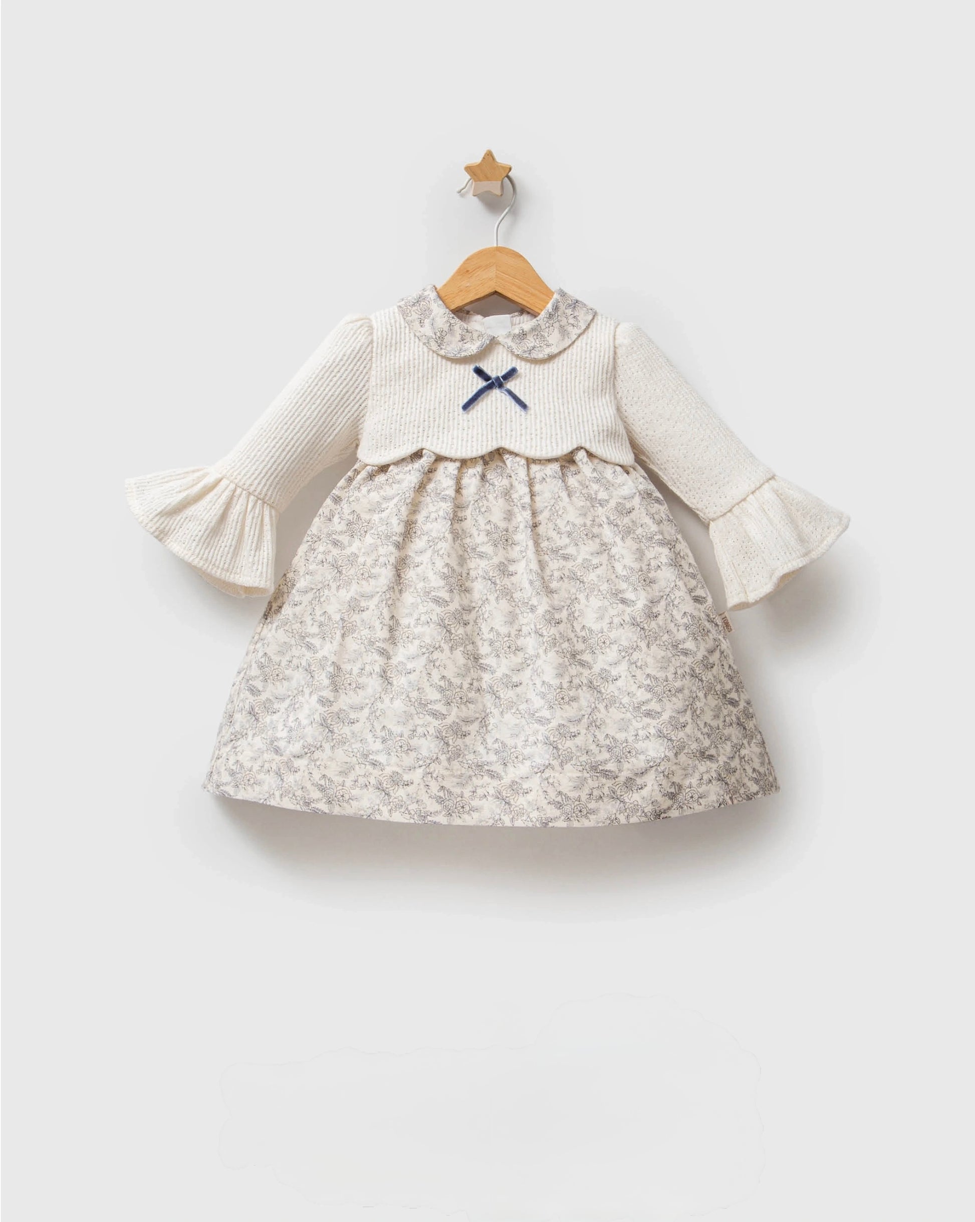 Gornji deo izrađen je od mekanog pamučnog pletiva koje greje, dok je donji deo od lagane tkanine sa sitnim cvetnim dezenom koji unosi dozu šarma u svaku jesenju i zimsku kombinaciju, a ispod se nalazi sloj tila koji daje bajkoviti volumen. Za potpuni komfor u dodiru sa kožom bebe, unutrašnji sloj je od čistog pamuka.