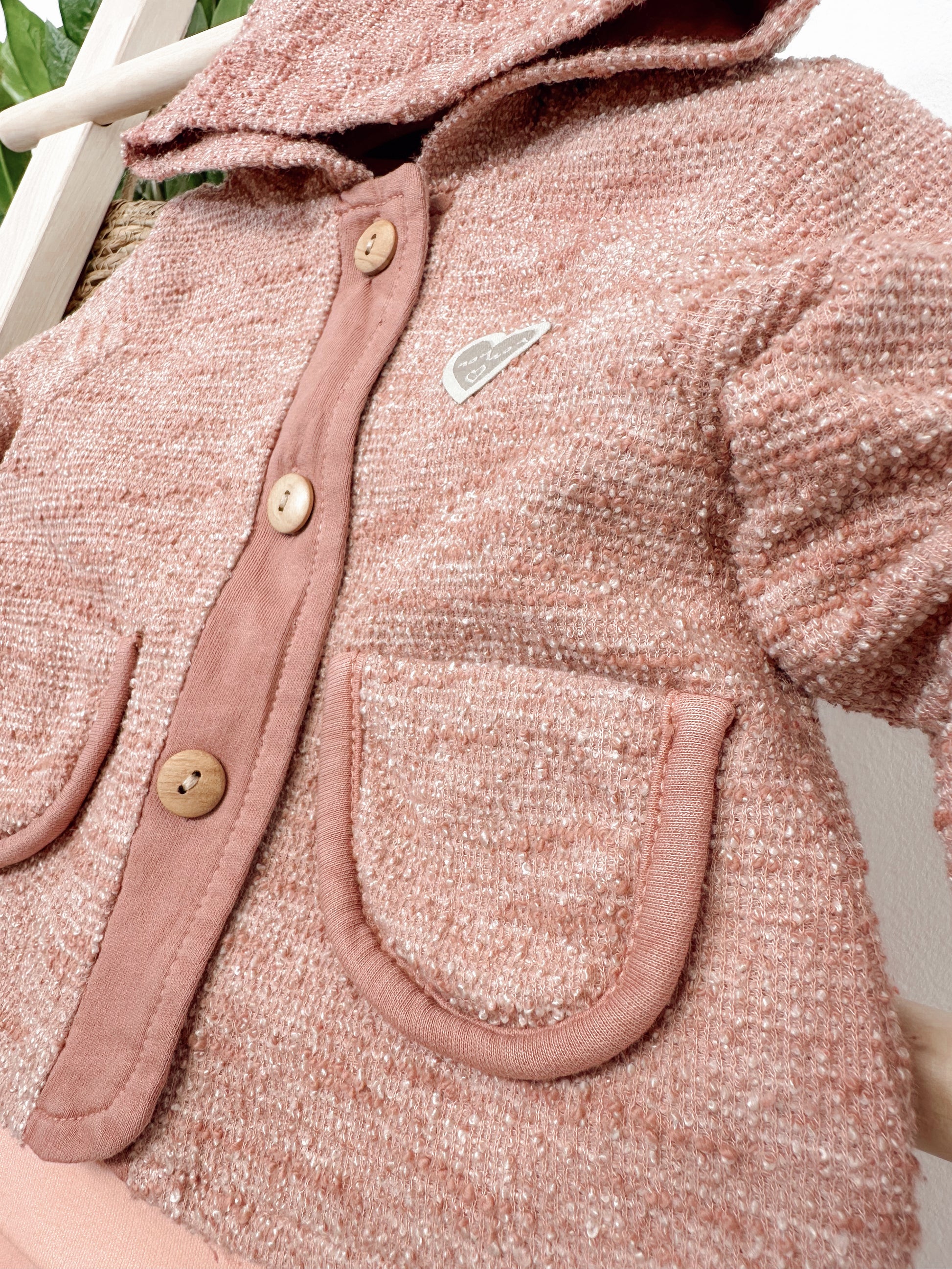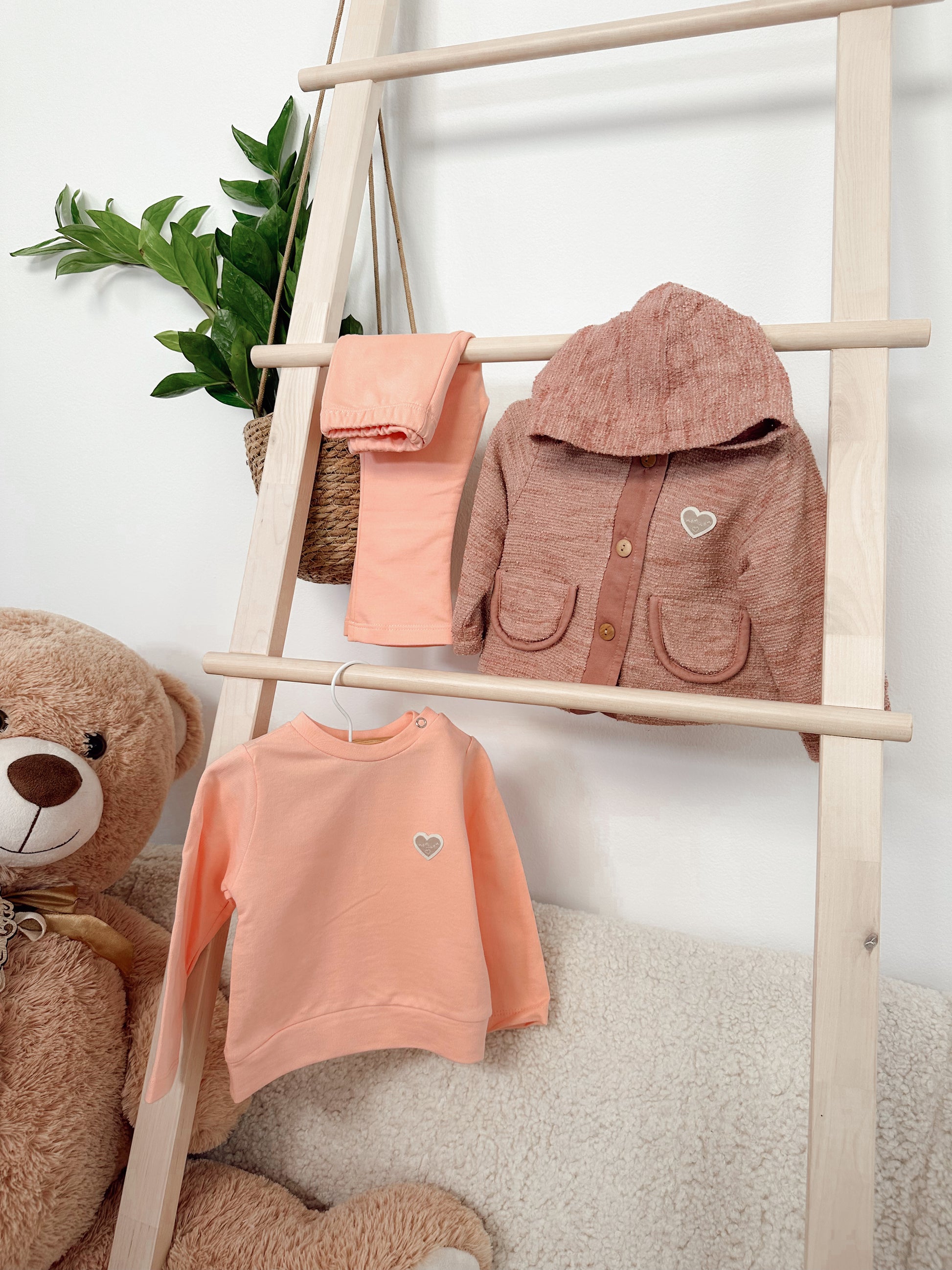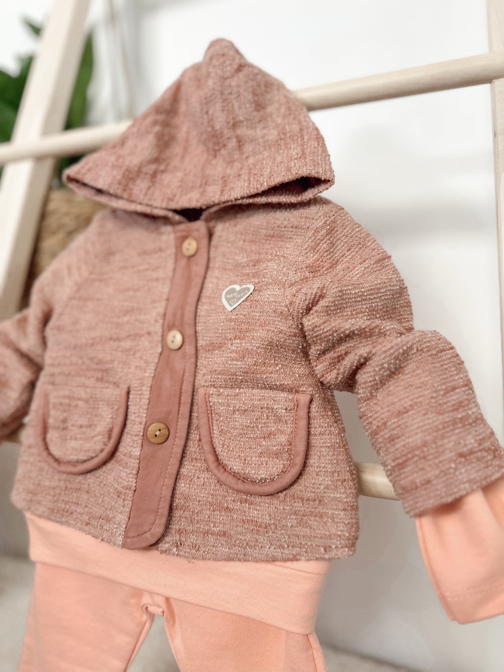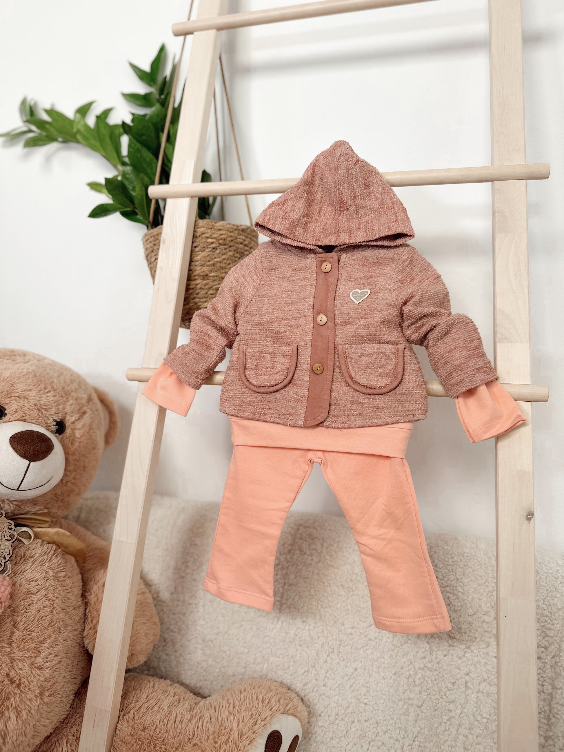Set sadrži pleteni jaknicu s drvenim dugmićima, majicu i udobne pantalonice.