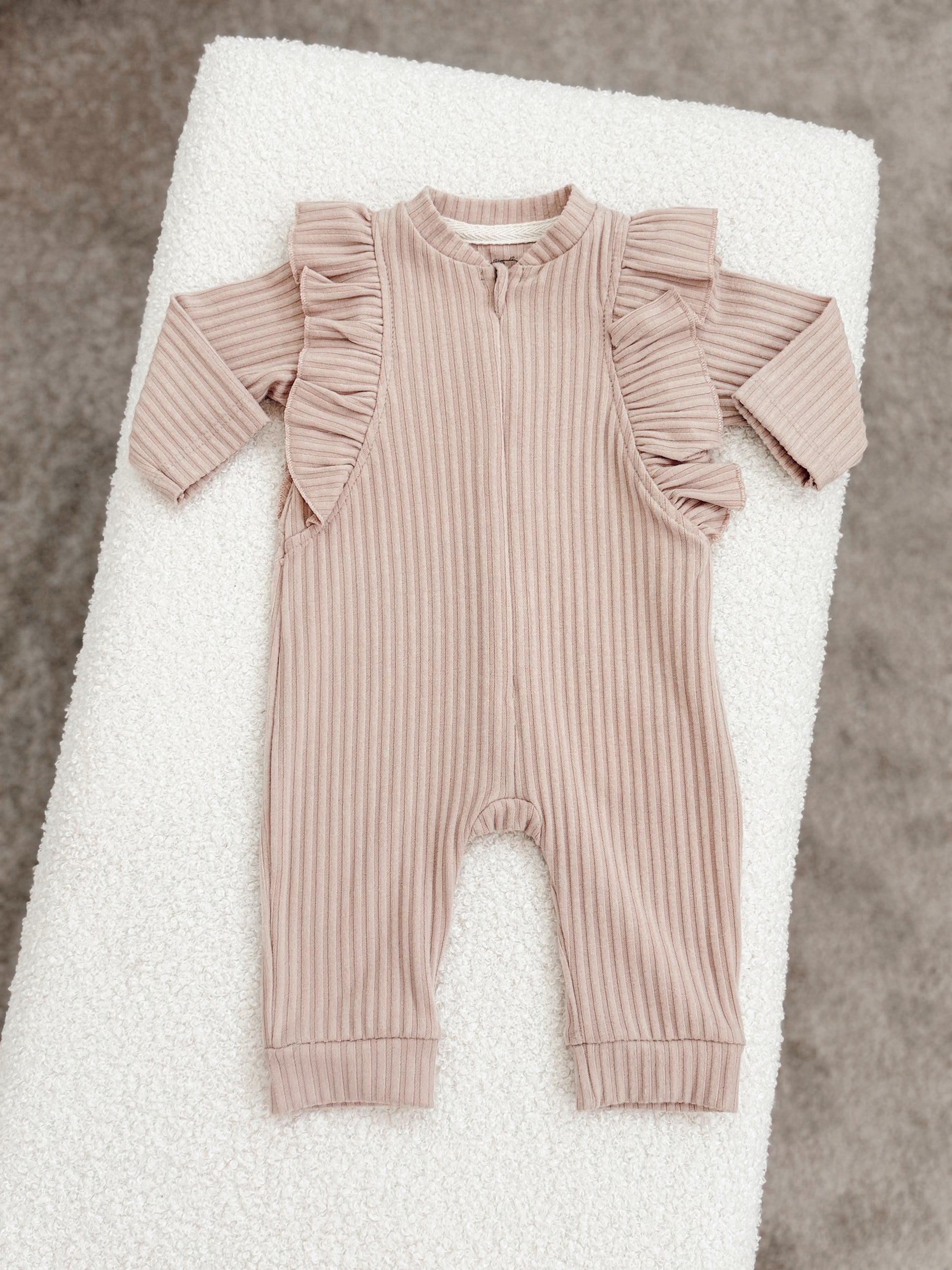 Nežan kombinezon u puder nijansi, izrađen od mekog rebrastog pamuka, prijatan za bebinu kožu i svakodnevno nošenje.