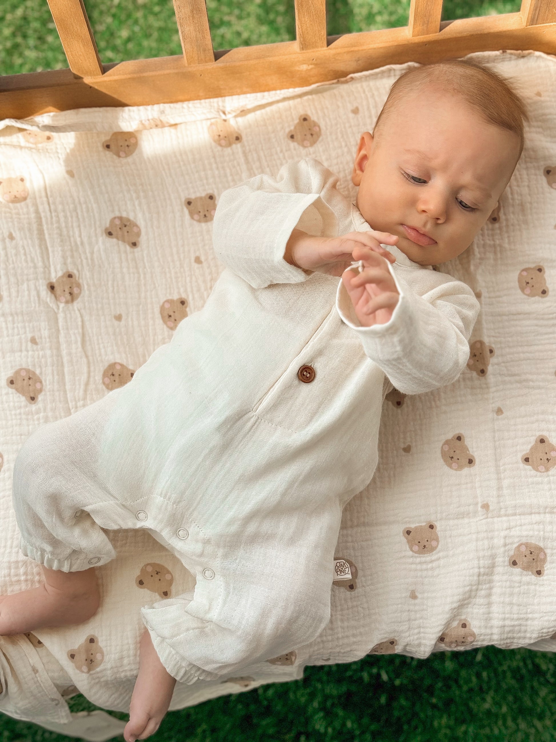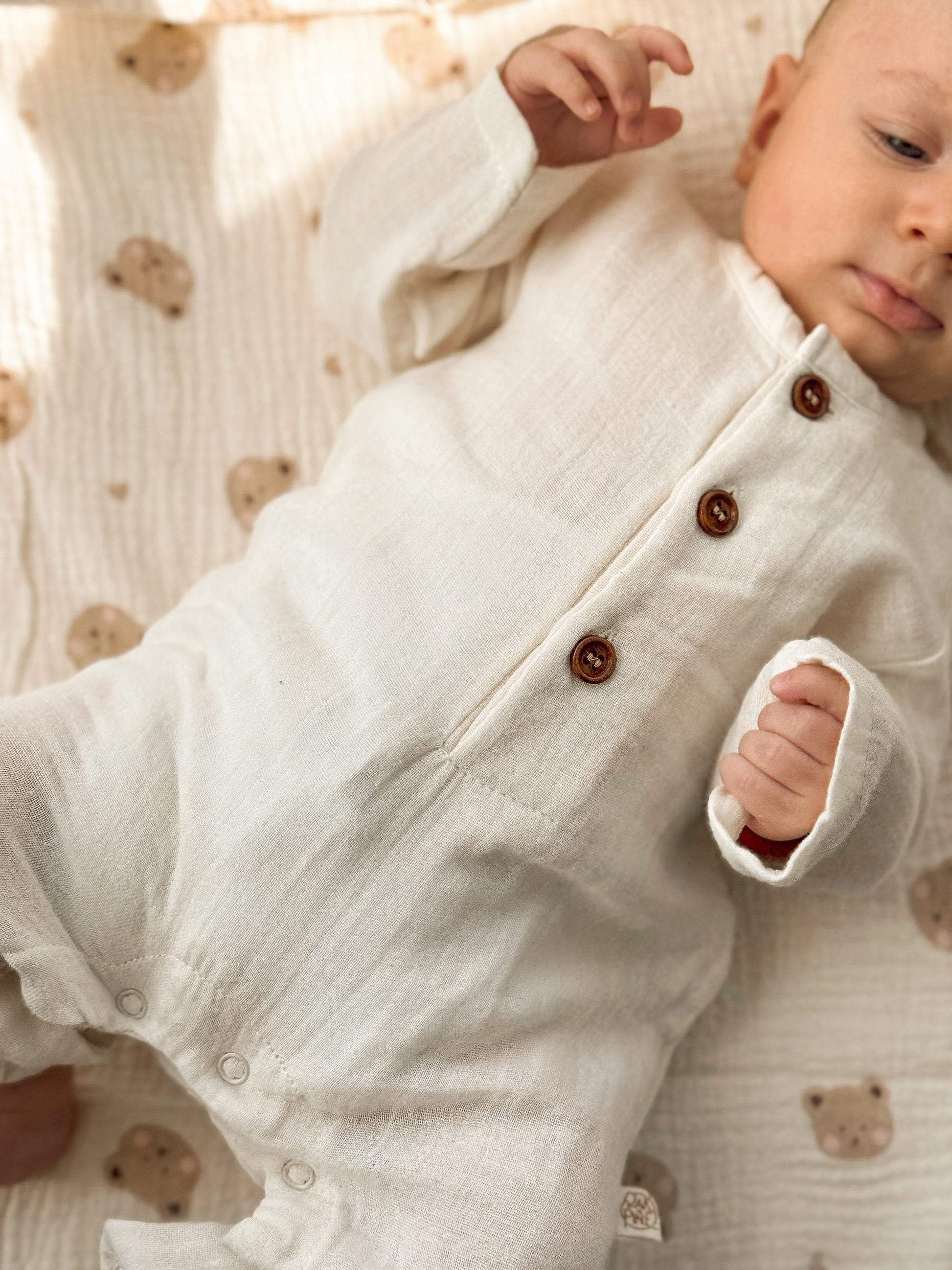 Naš prirodno održivi muslin je mekan i prozračan, idealan za avanture na otvorenom tokom proleća i leta. Ovaj kombinezon za bebe od muslina kombinuje modu i funkciju za moderno dete. Drvena dugmad daju dodatnu crtu stila ovom već zadivljujućem kombinezonu za bebe od muslina.