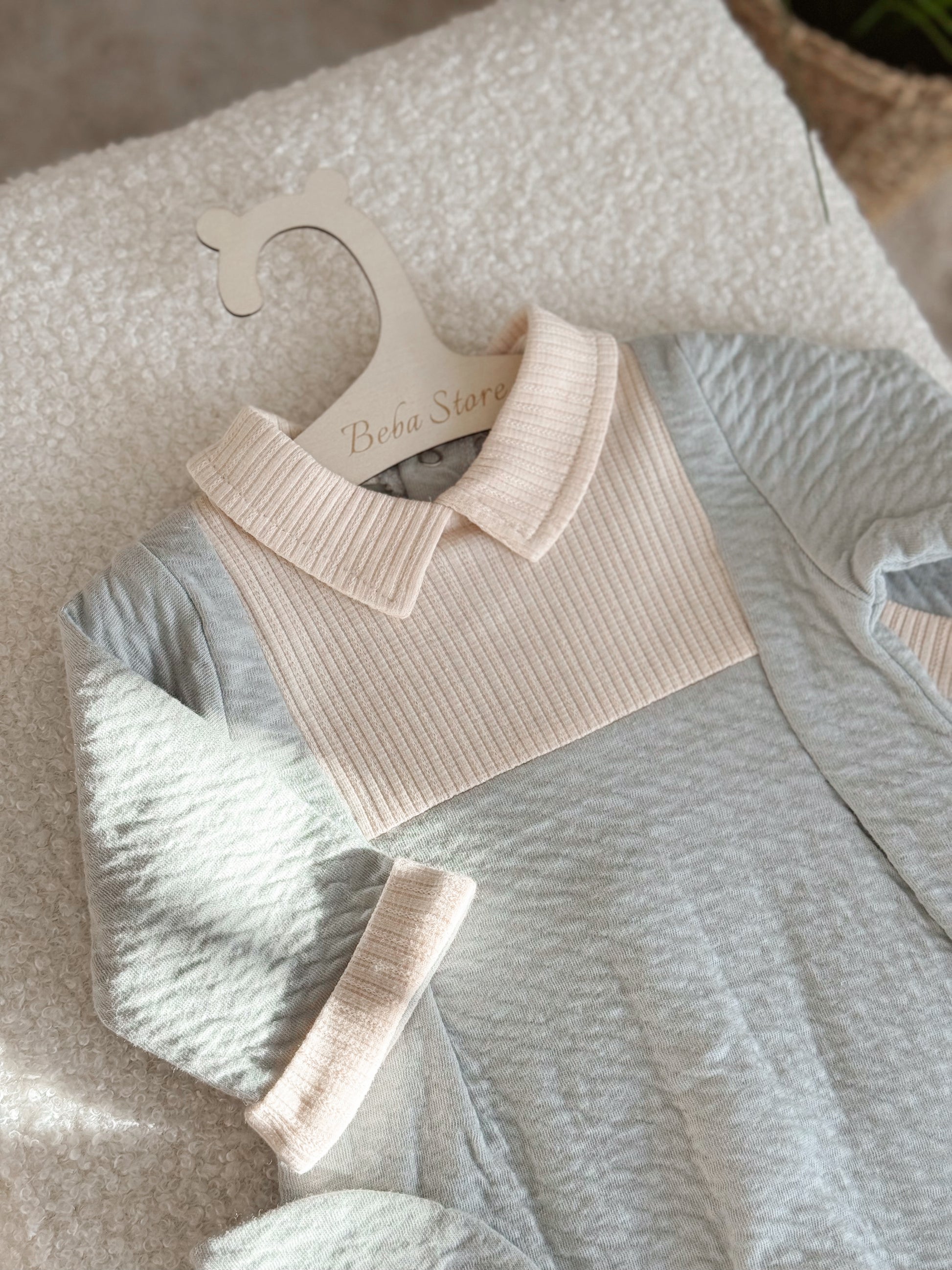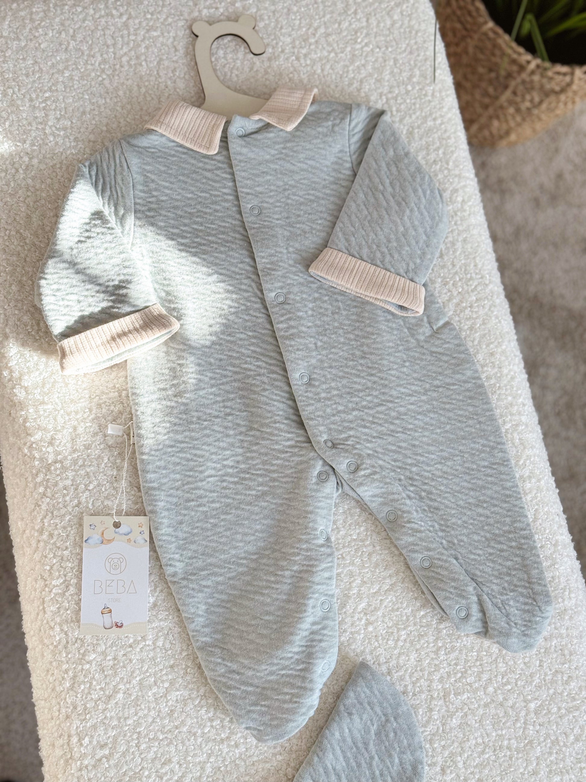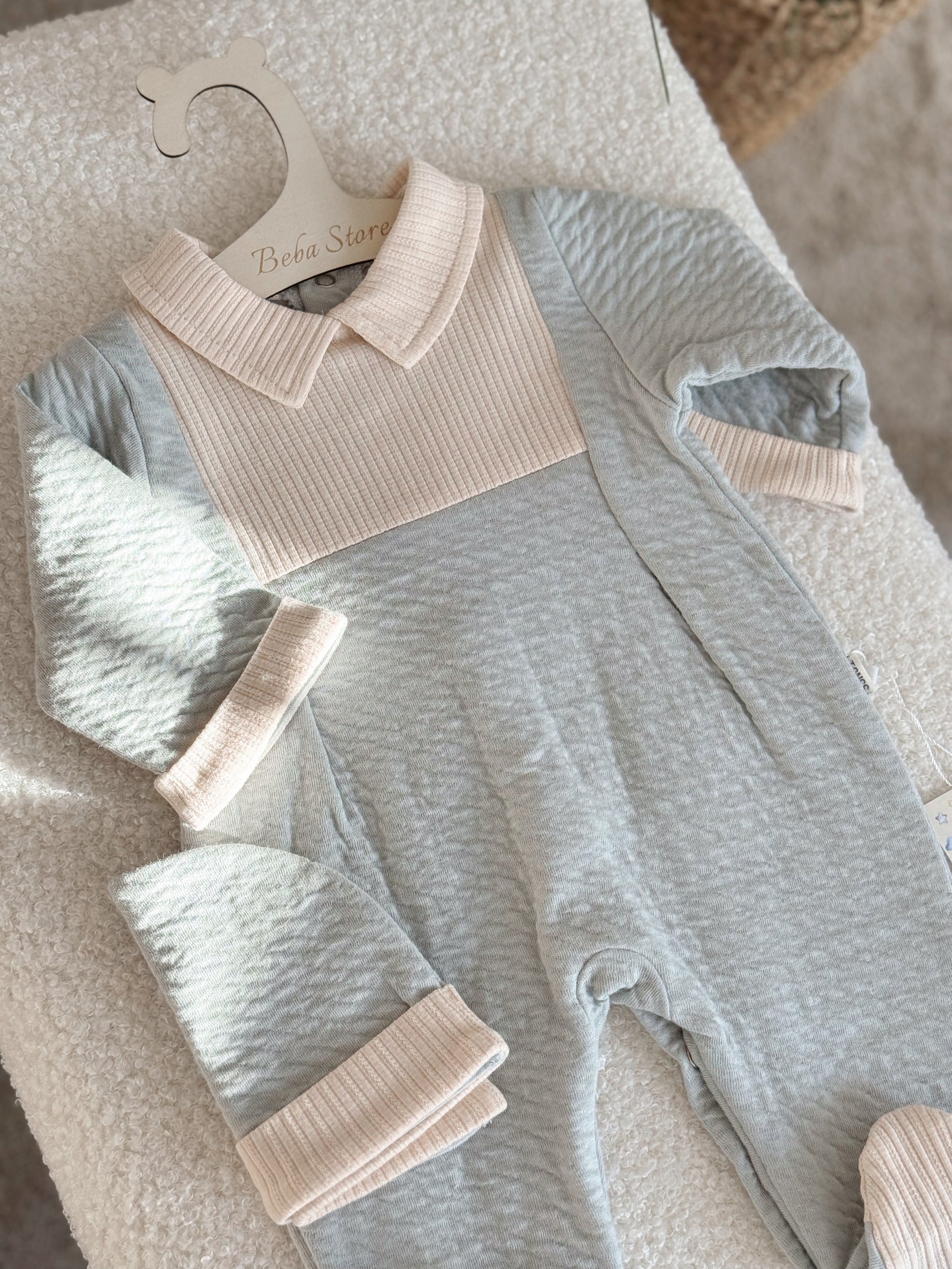 Nežan komplet za male dečake, sastoji se od kombinezona na kragnicu i kapice.