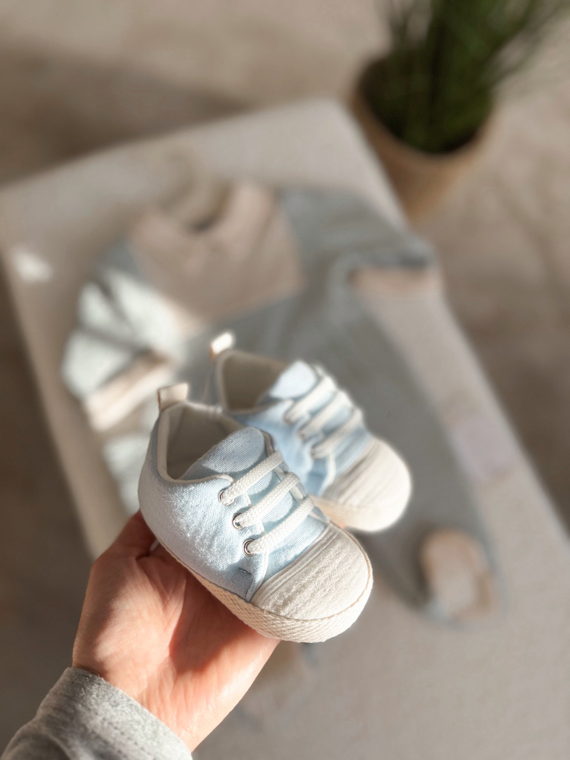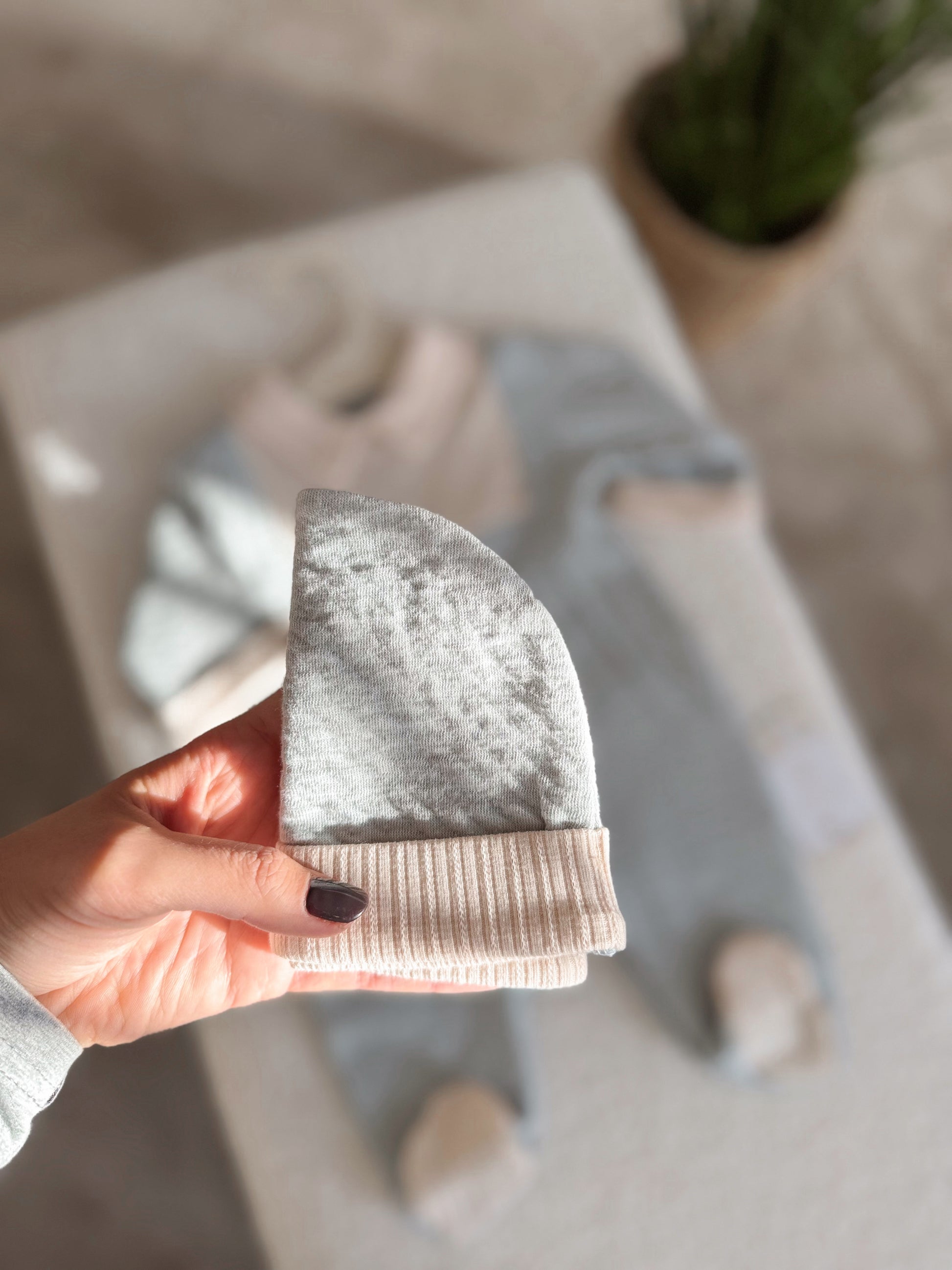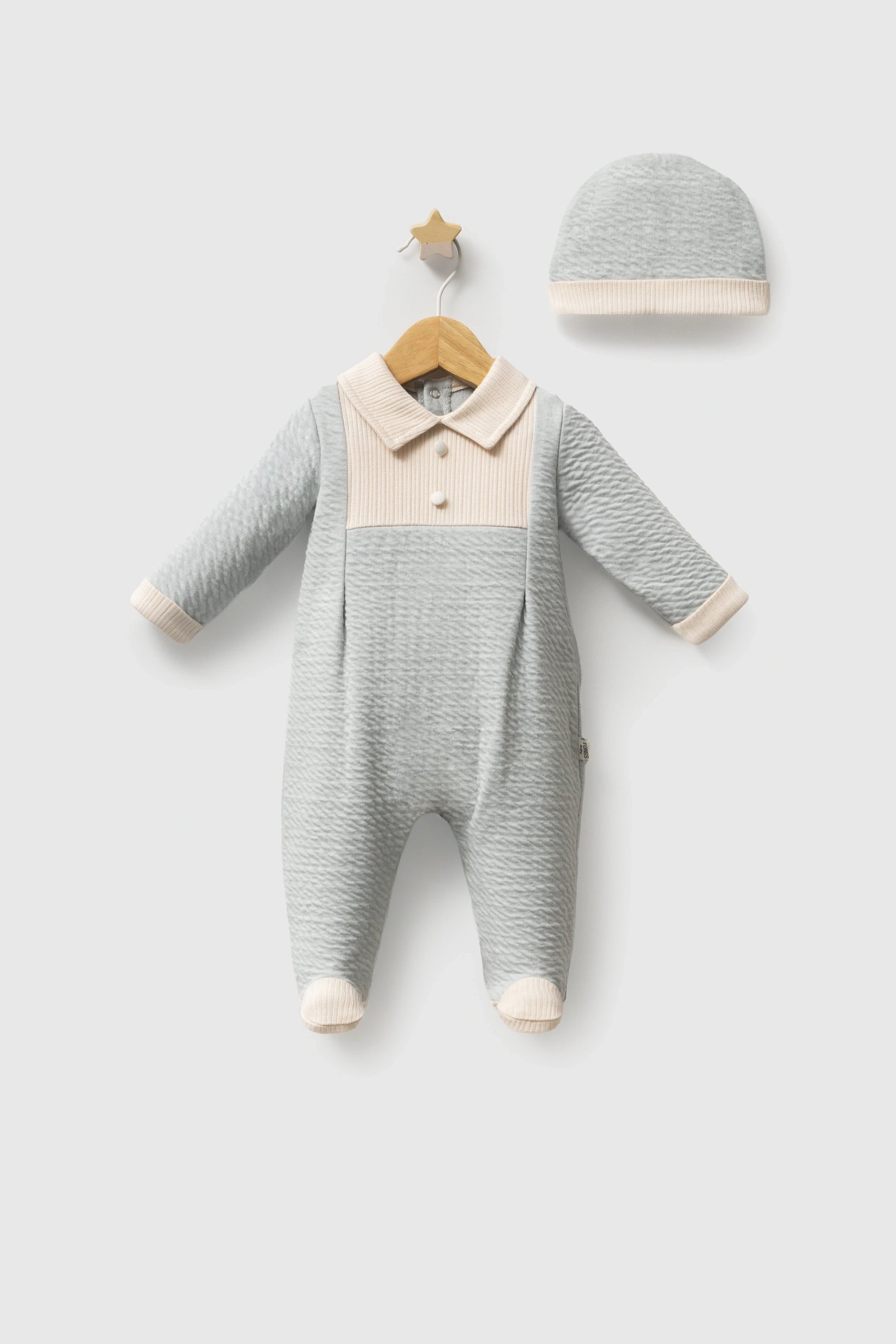 Nežan komplet za male dečake, sastoji se od kombinezona na kragnicu i kapice.