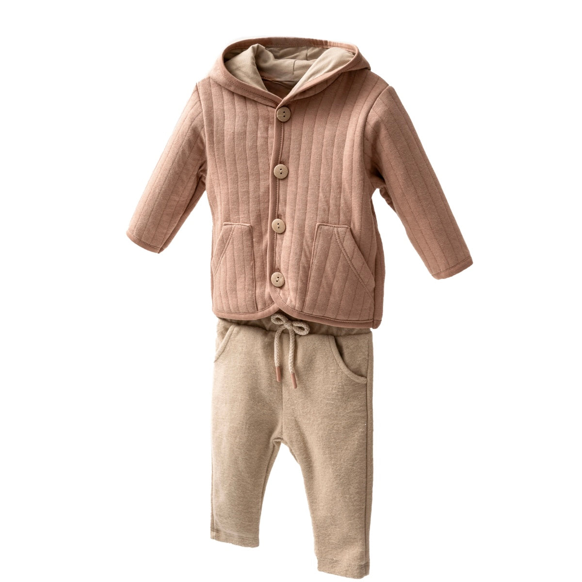 Dvodelni komplet od mekog pamuka. Kopčanje na dugmiće. Donji deo sa elastičnim pojasom.