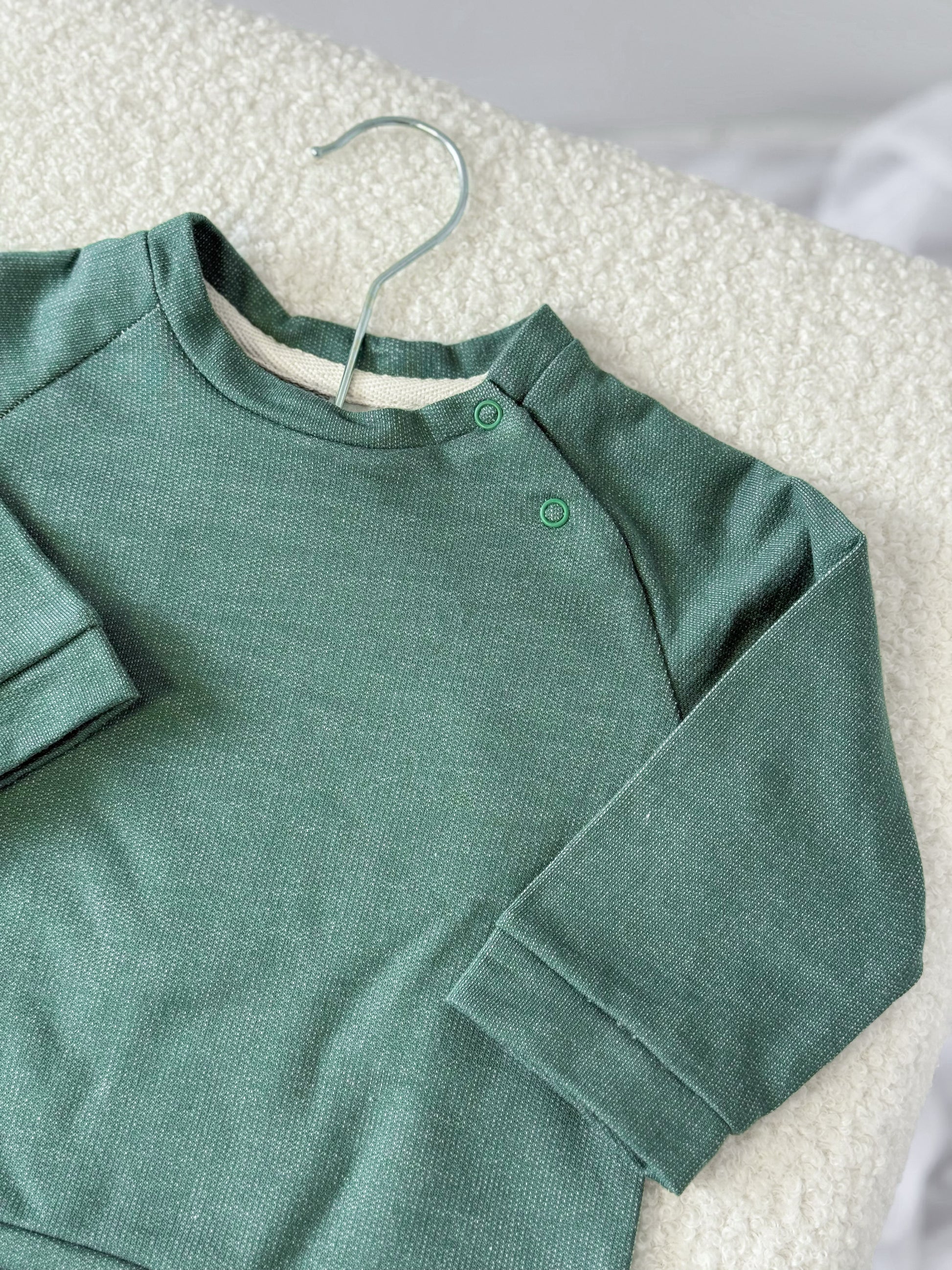 Dvodelni komplet od mekog pamuka. Kopčanje na ramenu. Donji deo sa elastičnim pojasom.