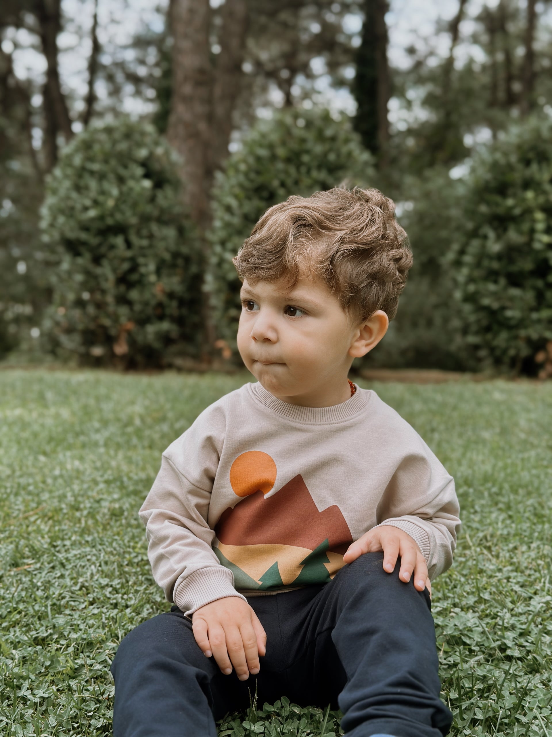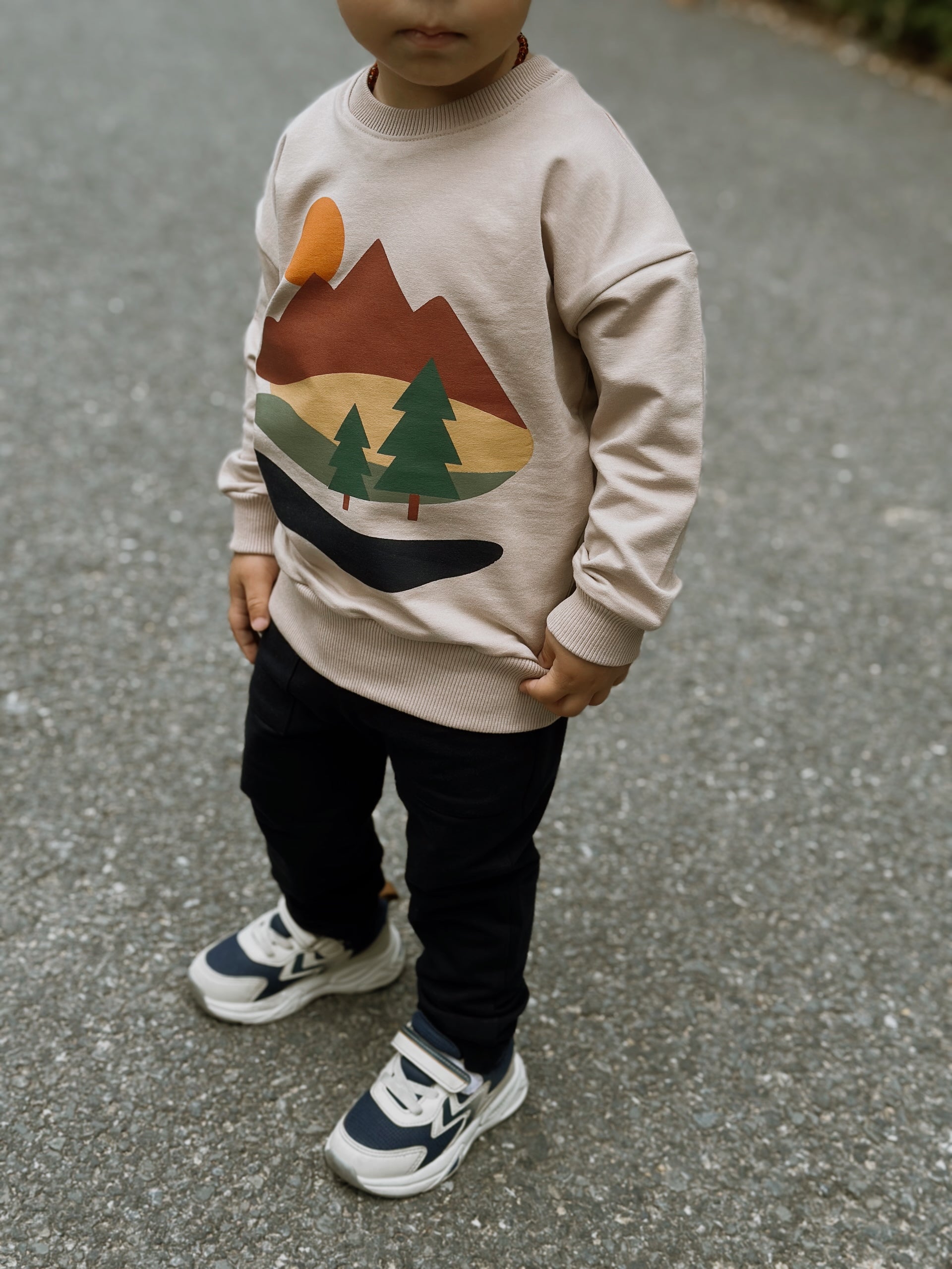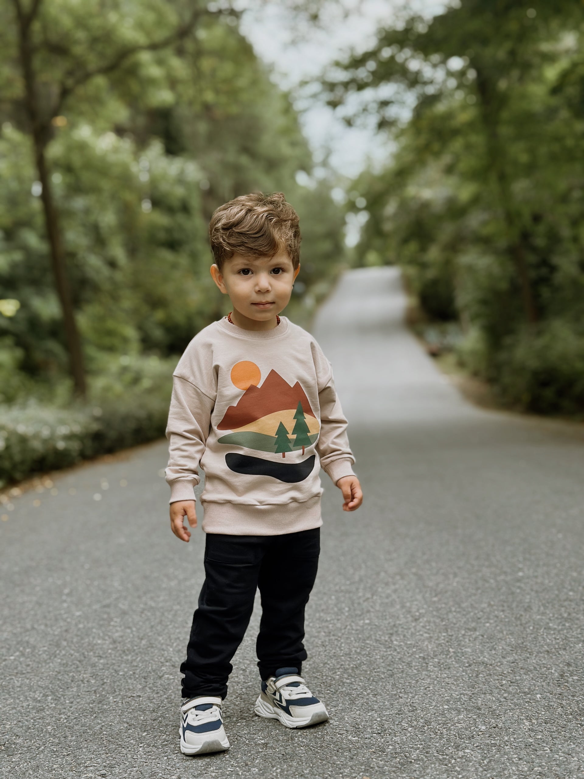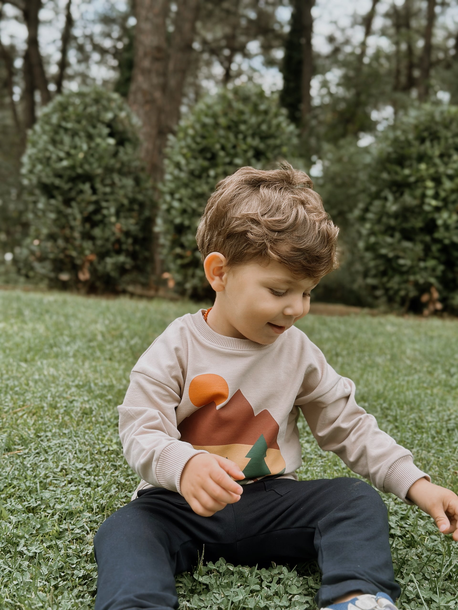 Naš Mountain set sastoji se od krem duksa sa printom planine i donjeg dela u teget boji – savršena kombinacija udobnosti i stila za male istraživače.