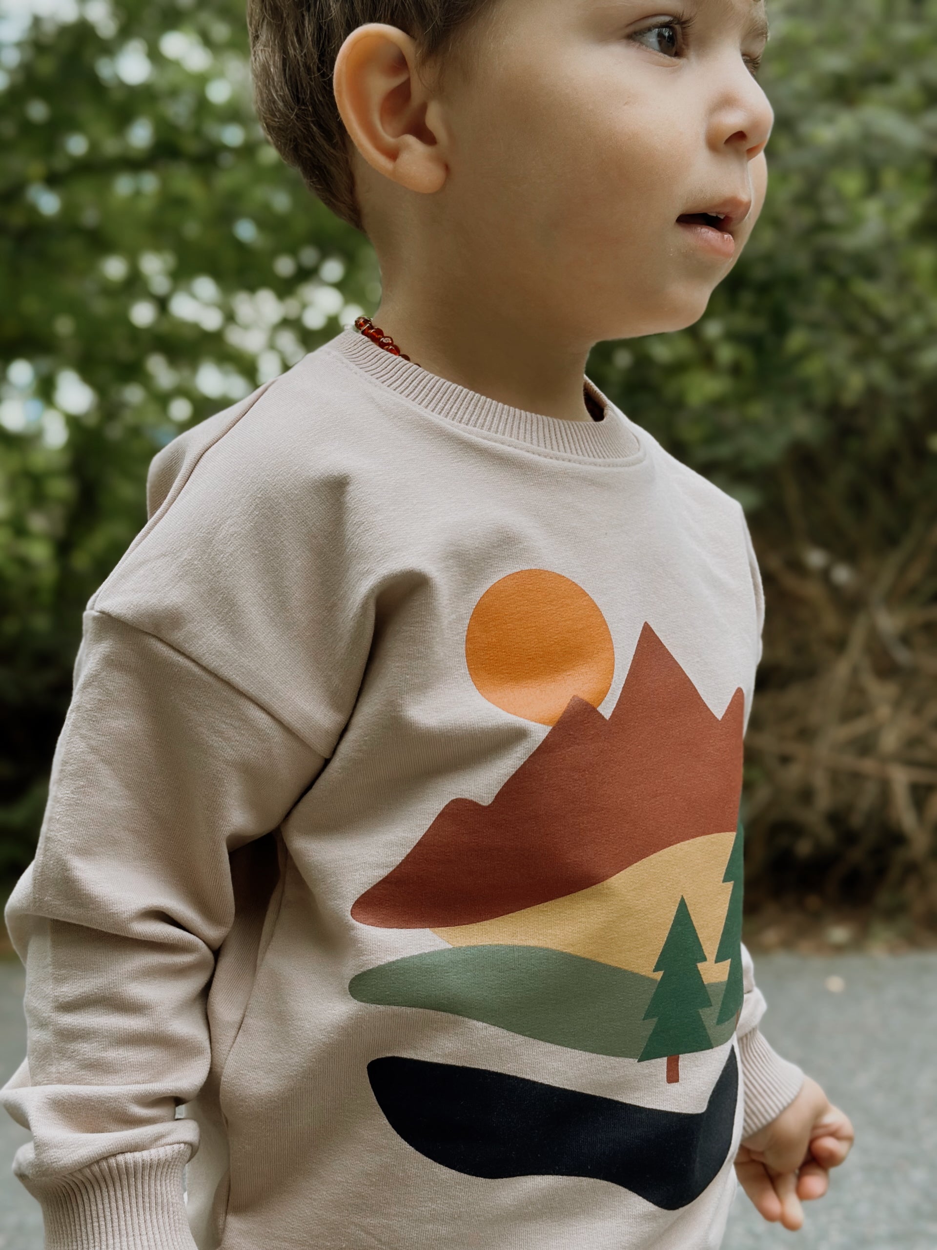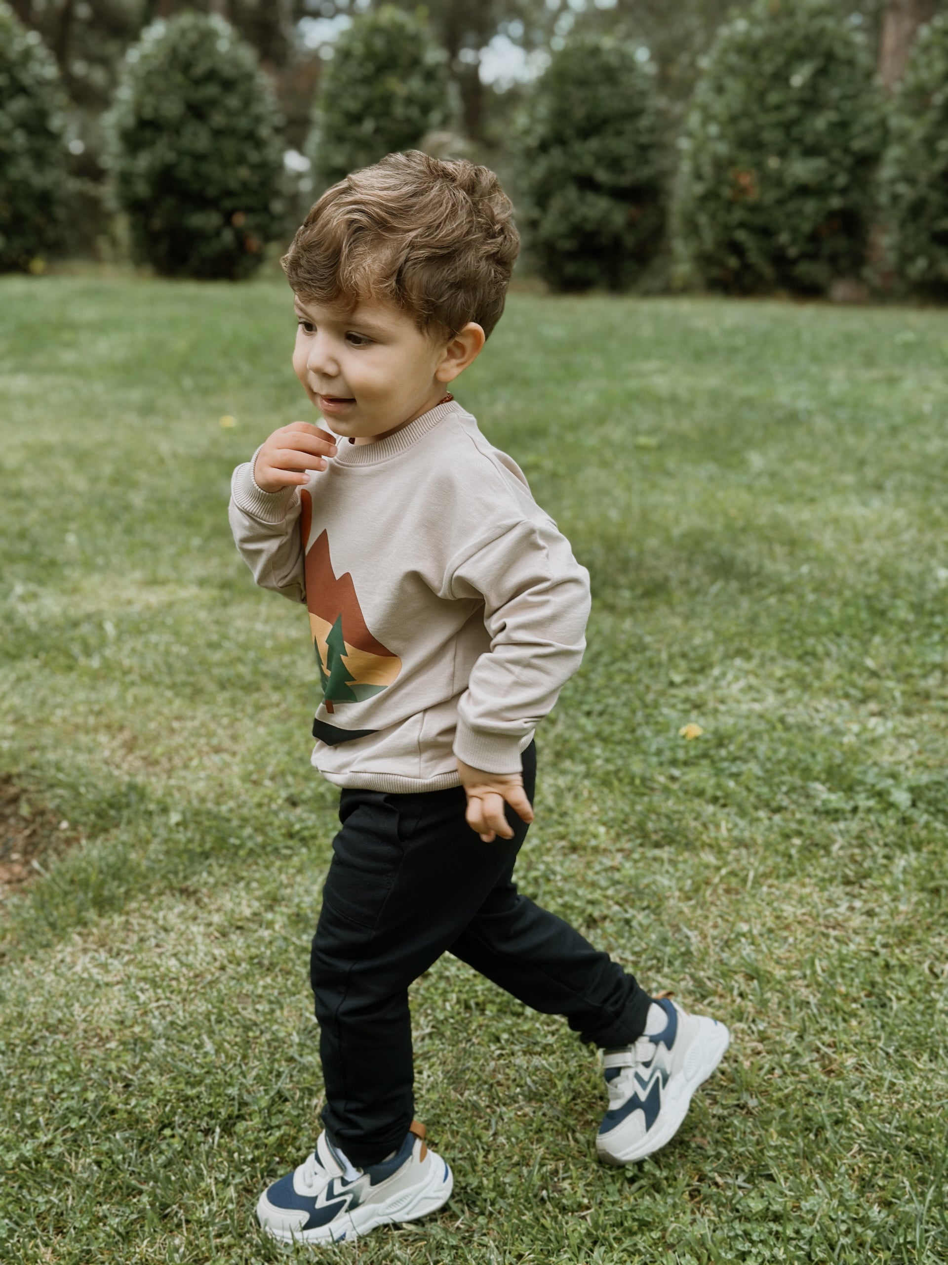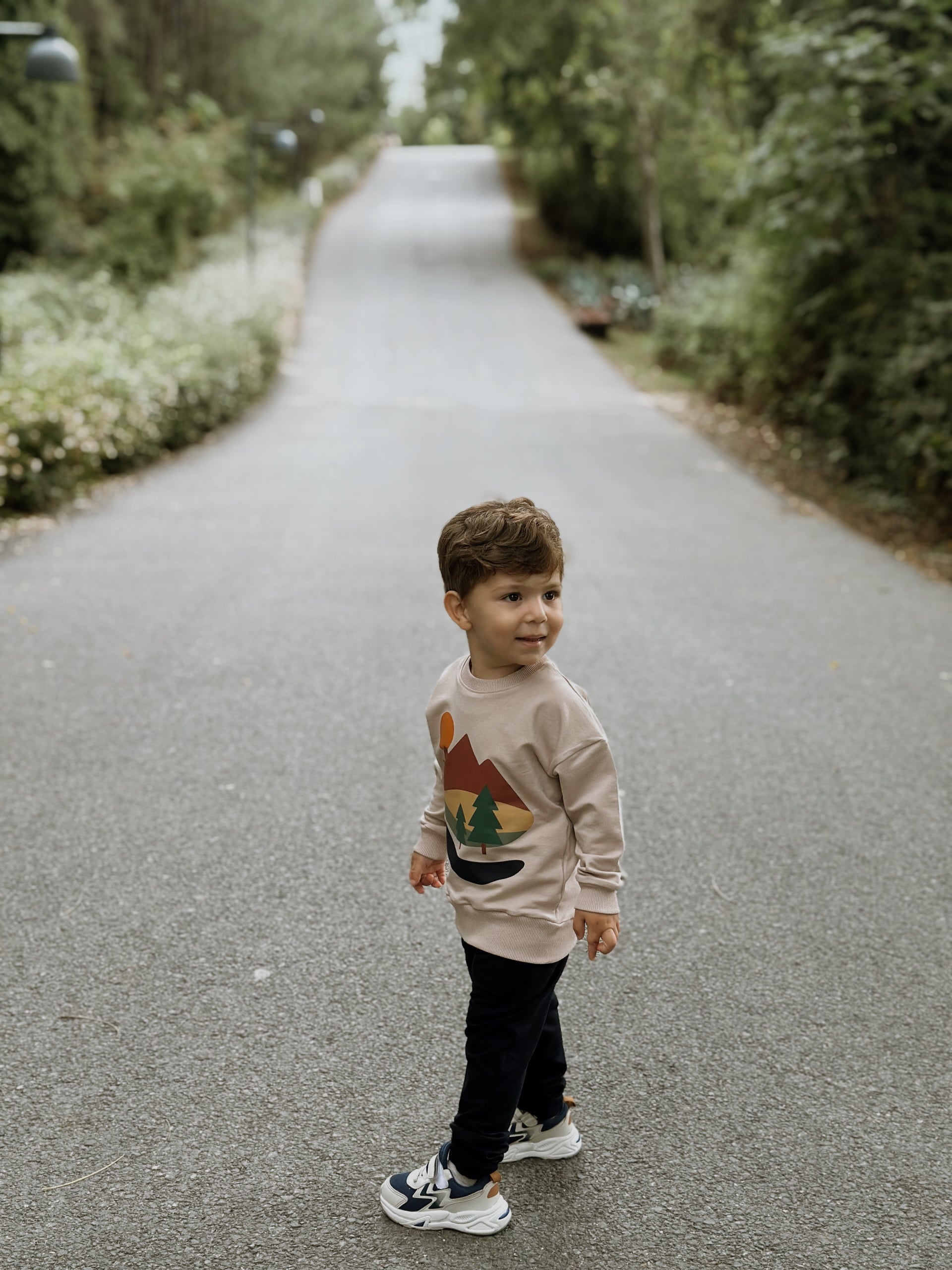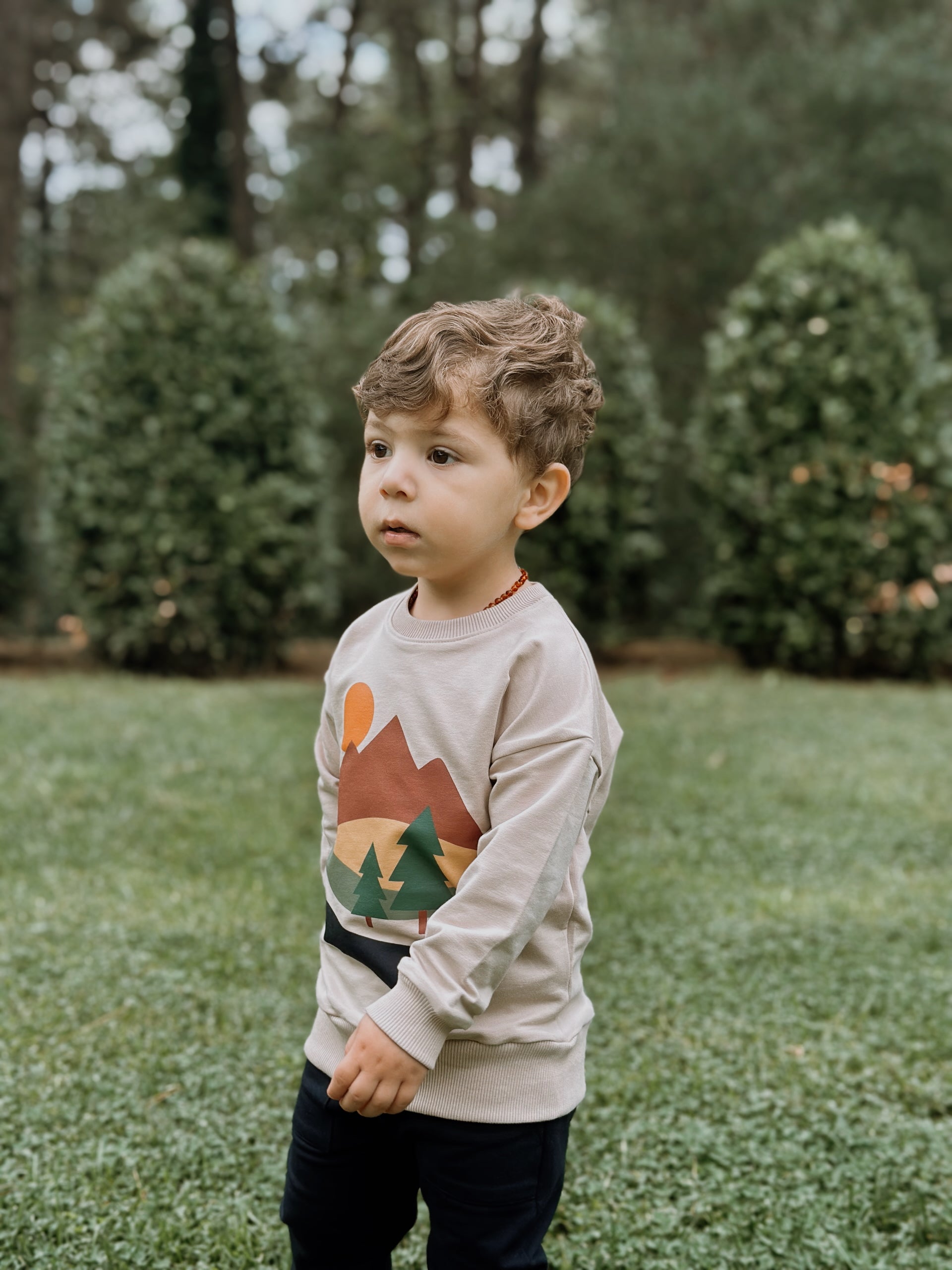 Naš Mountain set sastoji se od krem duksa sa printom planine i donjeg dela u teget boji – savršena kombinacija udobnosti i stila za male istraživače.