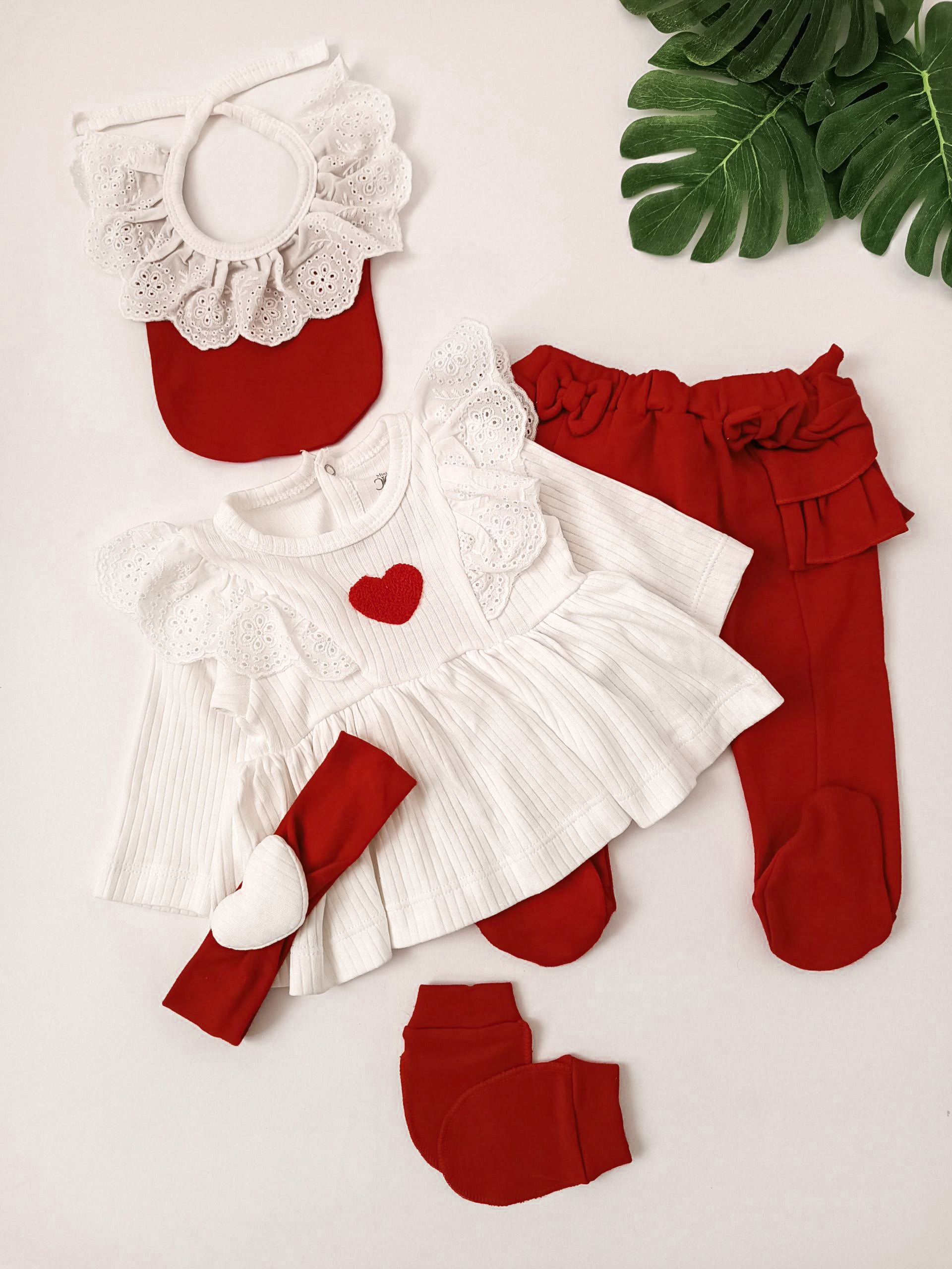 Nežan petodelni set idealan za prve mesece bebe. Izrađen je od mekog, prijatnog pamuka koji obezbeđuje udobnost i celodnevno nošenje. Set čine bluzica sa čipkanim volanima i aplikacijom srca, udobne pantalone sa volanima, rukavice, traka za kosu sa srcem i odgovarajuća portikla sa dekorativnim volanom.