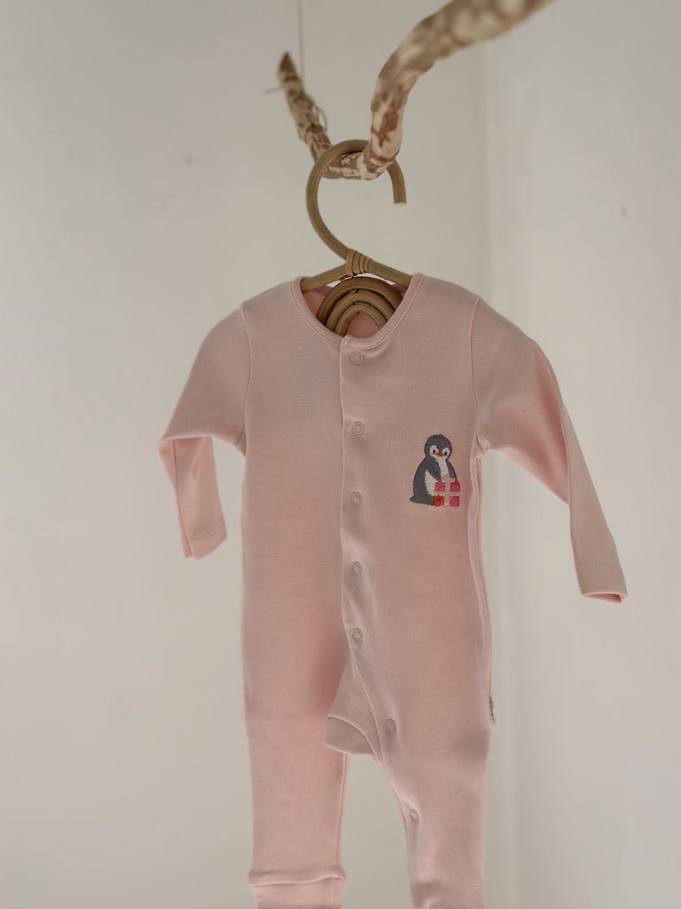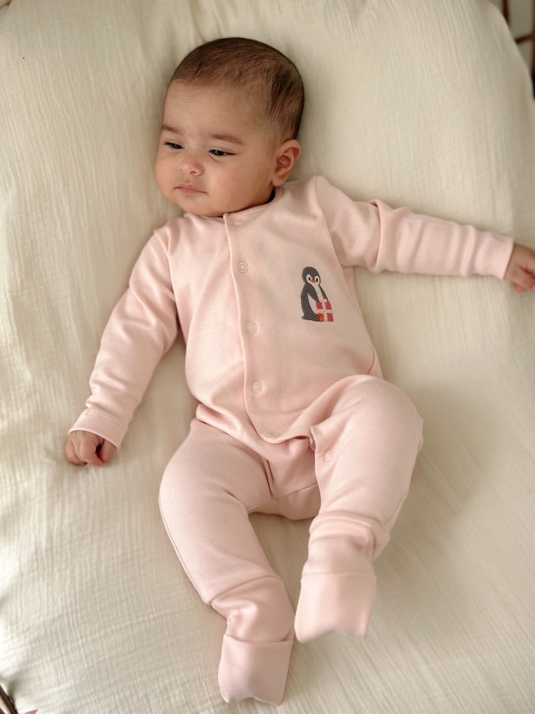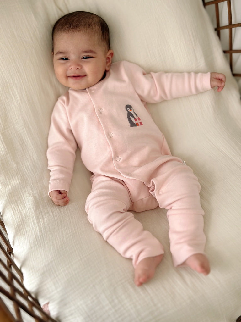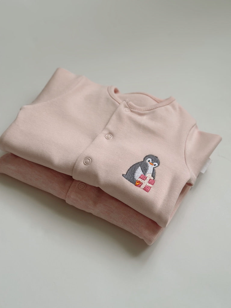 Kombinezon je ukrašen vezenim pingvinom, koji donosi dozu nežnosti i šarma svakom malom izgledu.