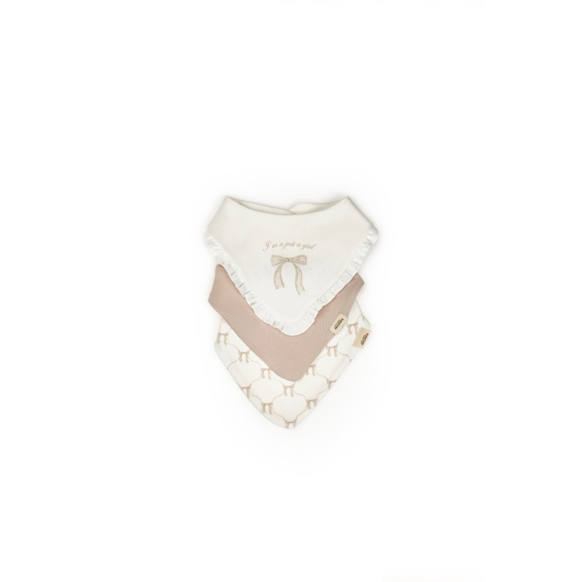 Set sadrži tri portikle od organskog pamuka – jednu sa dezenom mašnica i dve u usklađenim, jednobojnim tonovima.