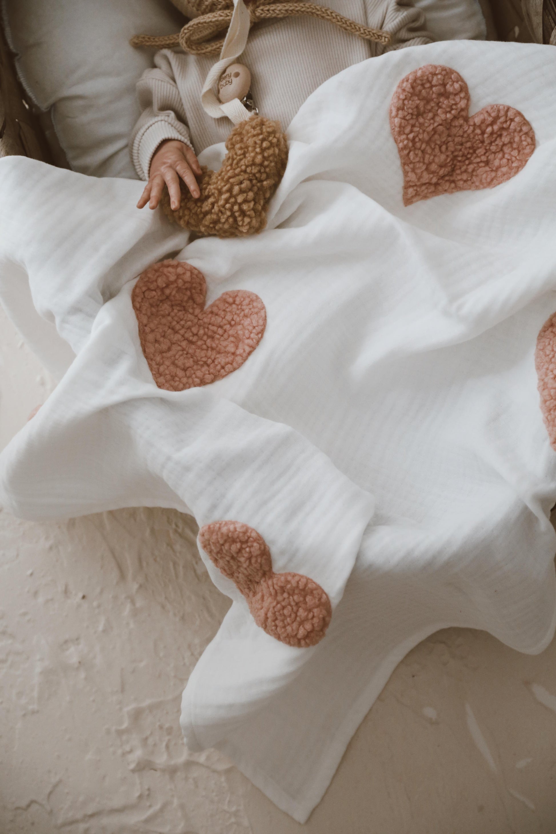 Izrađen od 100% pamuka, od četvoroslojnog muslin pamuka koje je lagano, prozračno i prijatno za bebinu kožu. Aplikacije su od teddy materijala, laser sečene i u potpunosti prošivene duž ivica, što obezbeđuje dugotrajnost i postojan oblik.