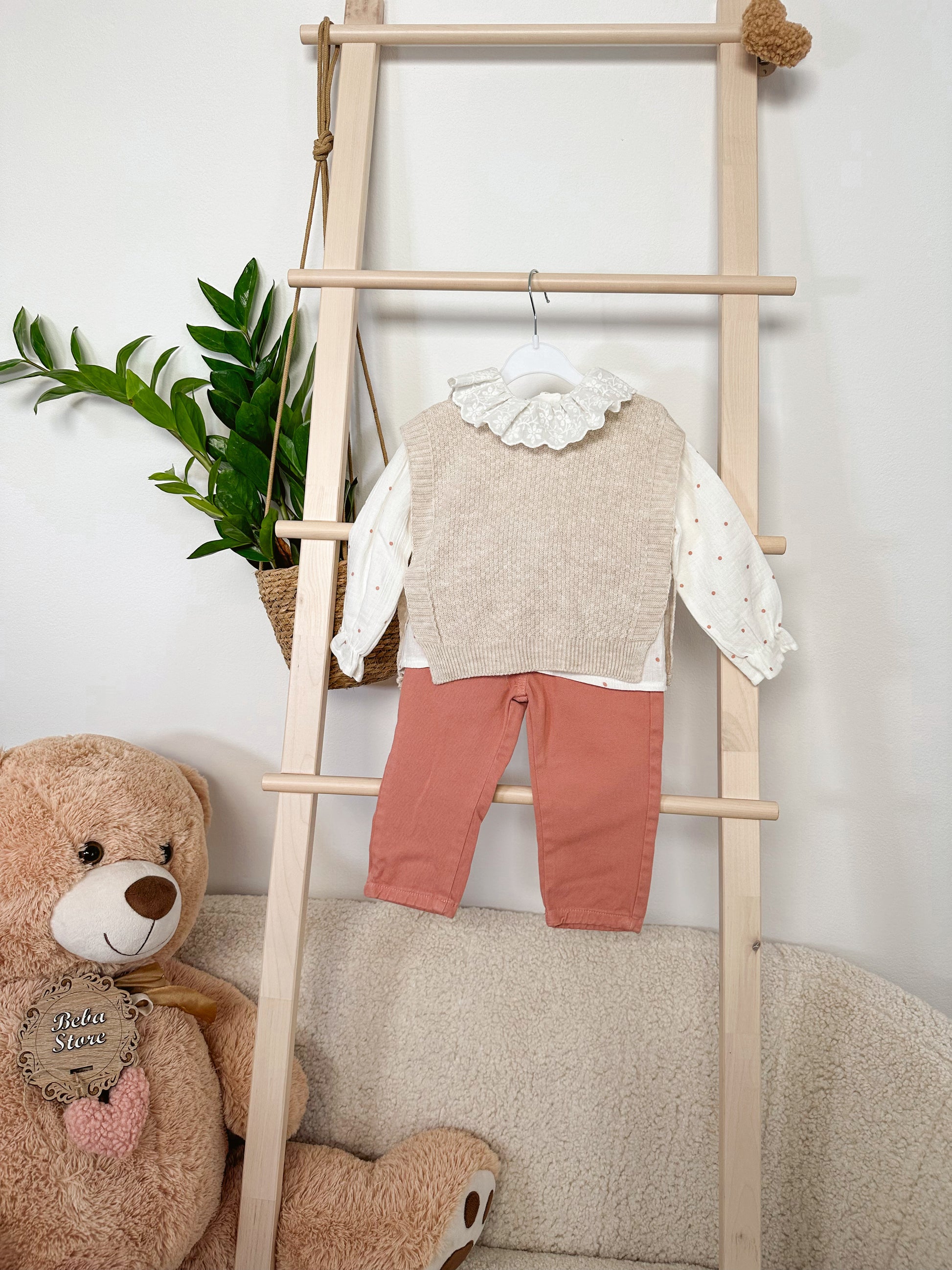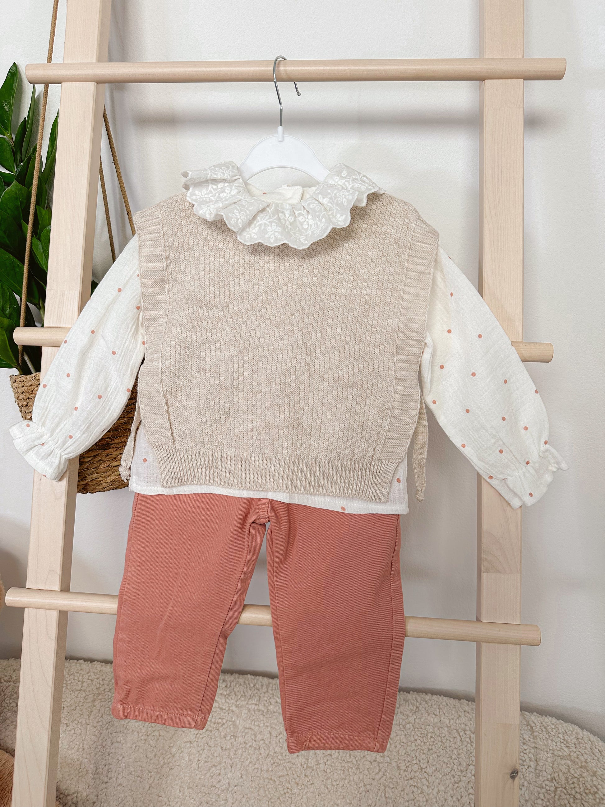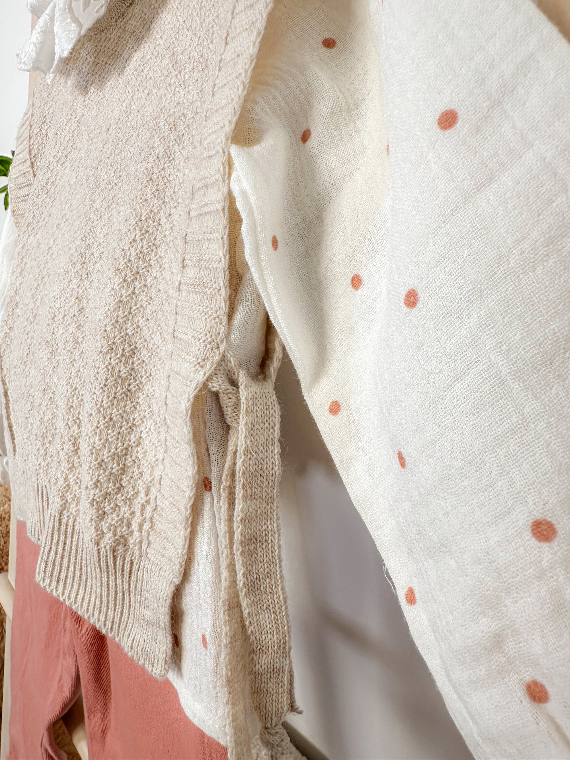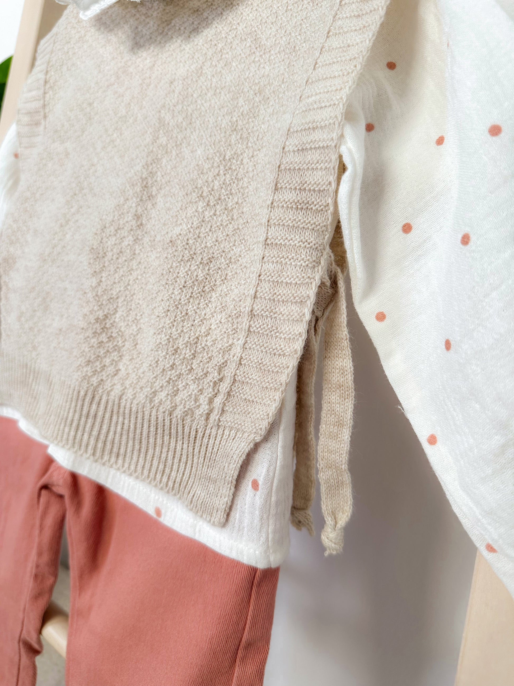 - pleteni prsluk u bež nijansi sa vezivanjem sa strane,