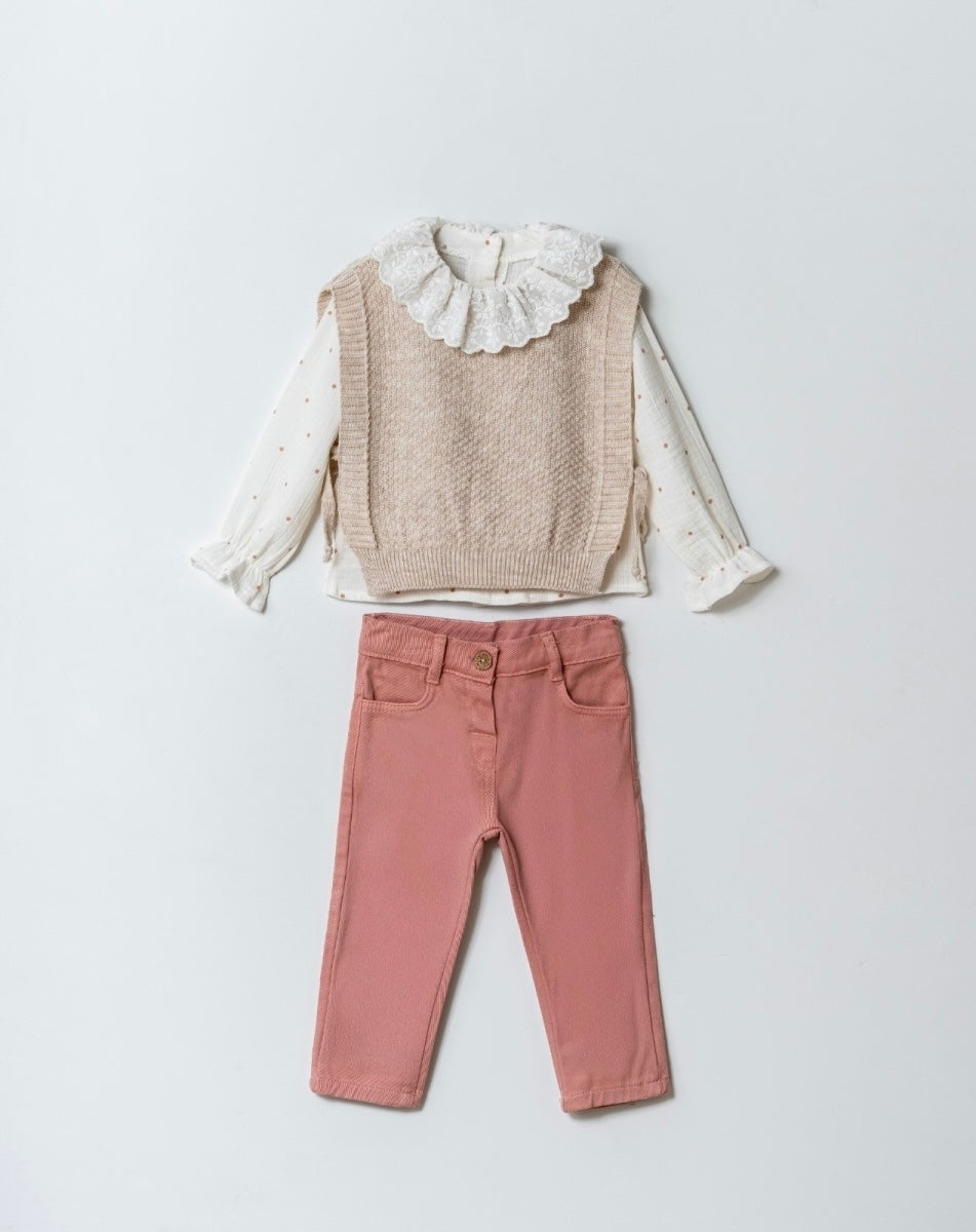 - pamučnu bluzu sa nežnim tačkicama i dekorativnom čipkastom kragnicom,
