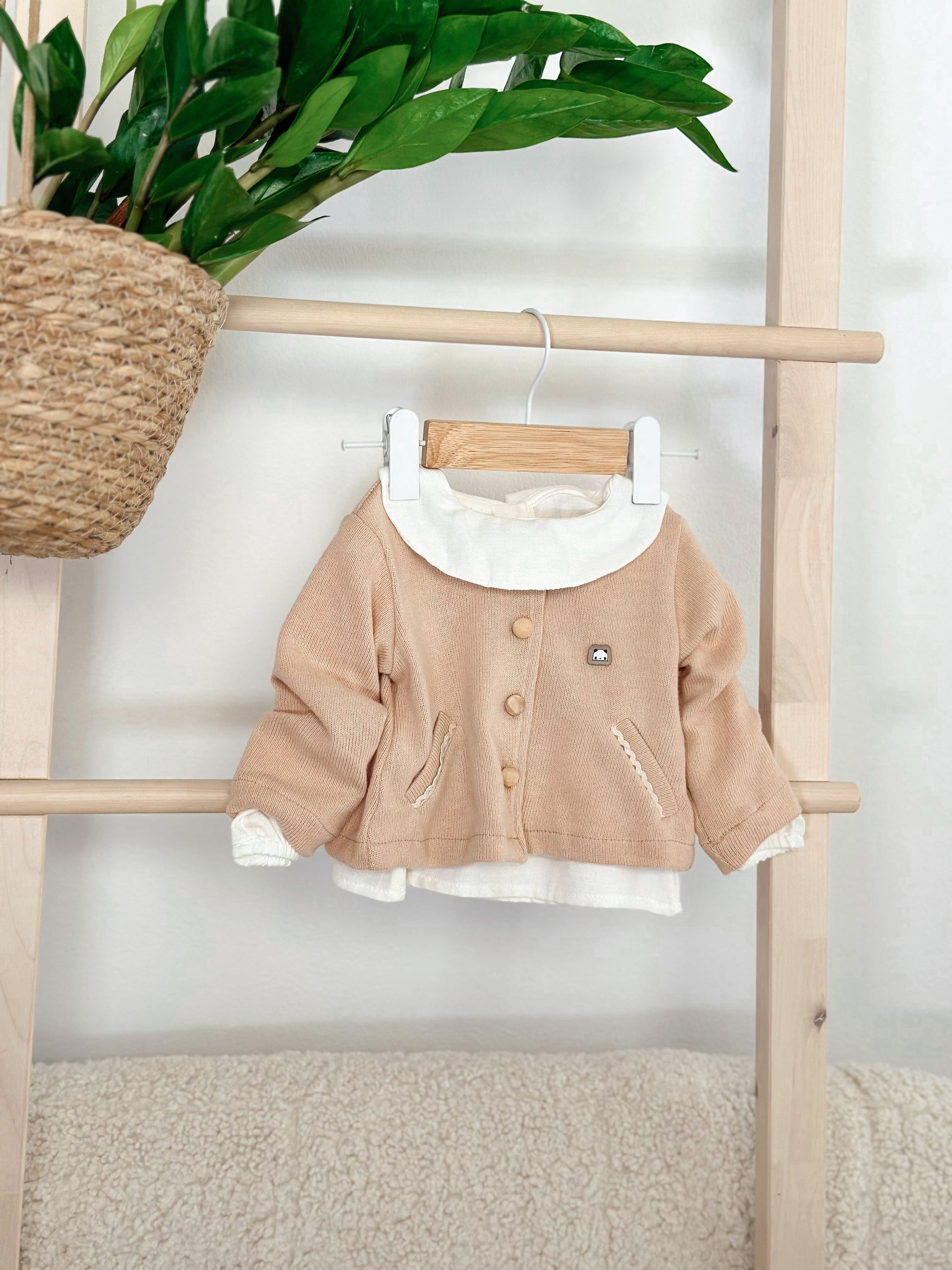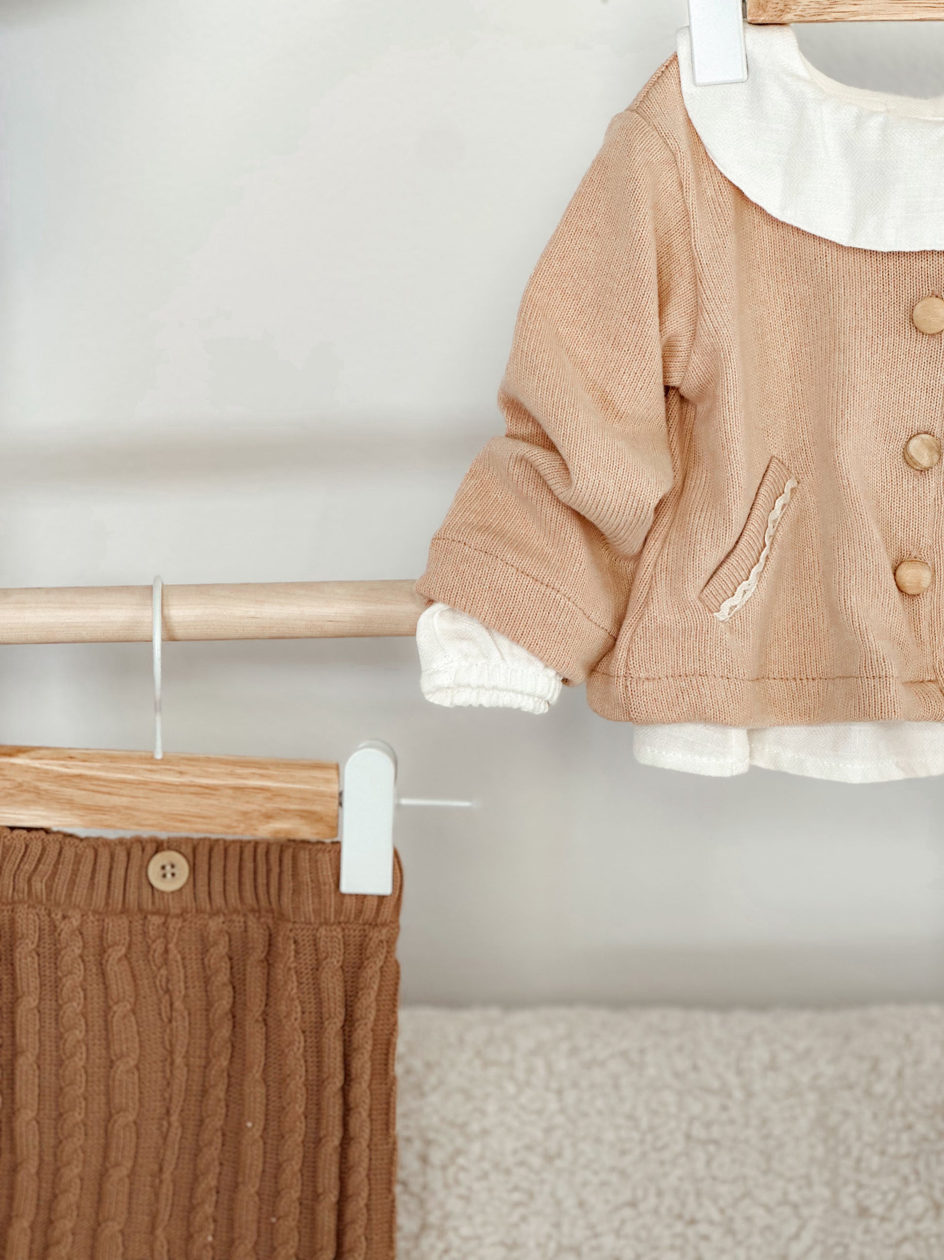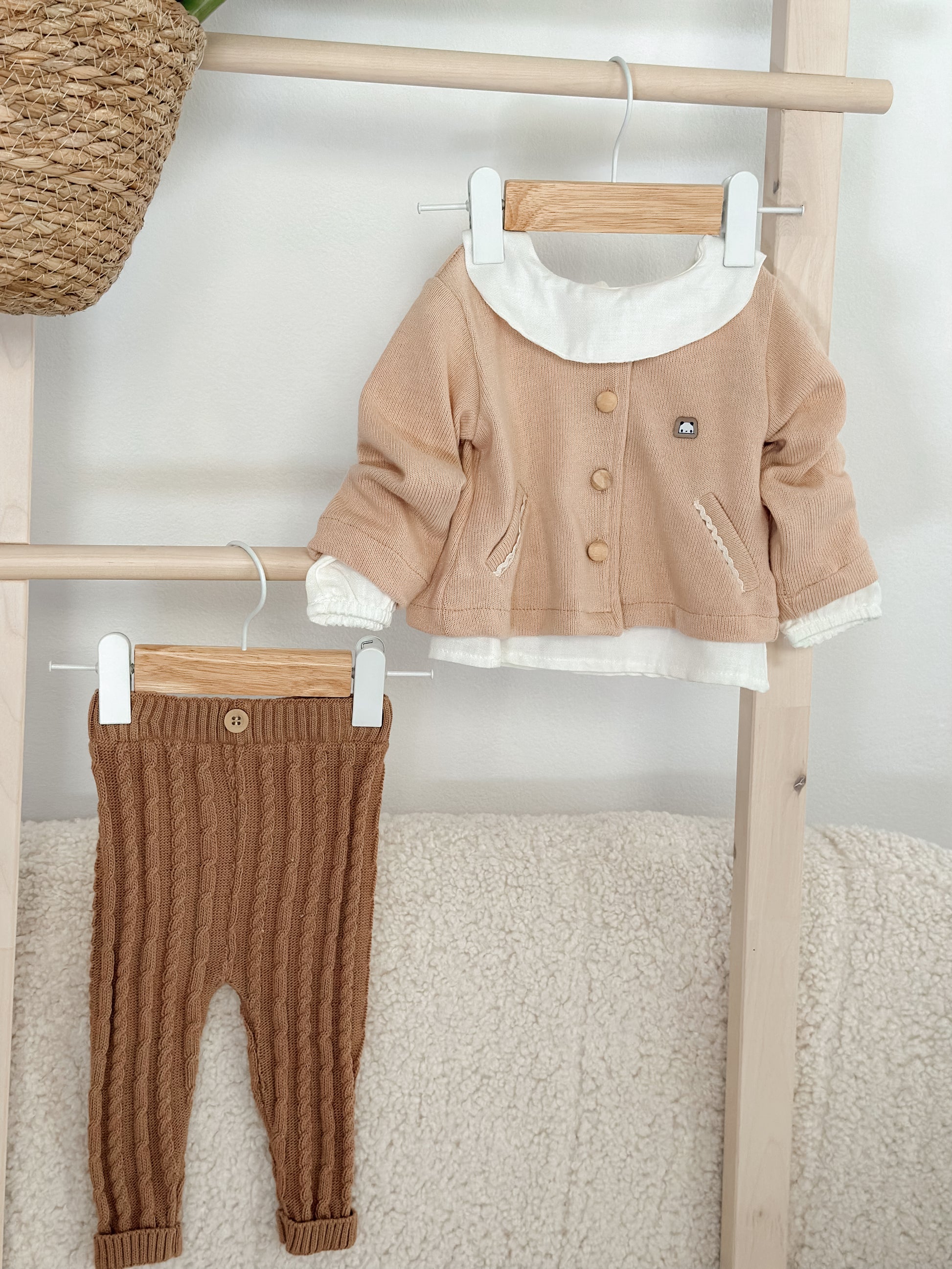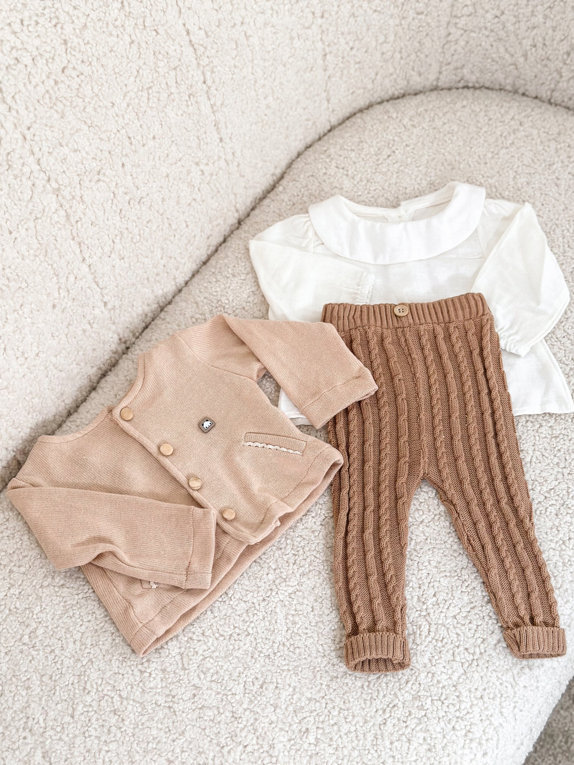 Set sadrži pleteni džemper s drvenim dugmićima, košuljicu-majicu s kragnicom i udobne triko helanke.