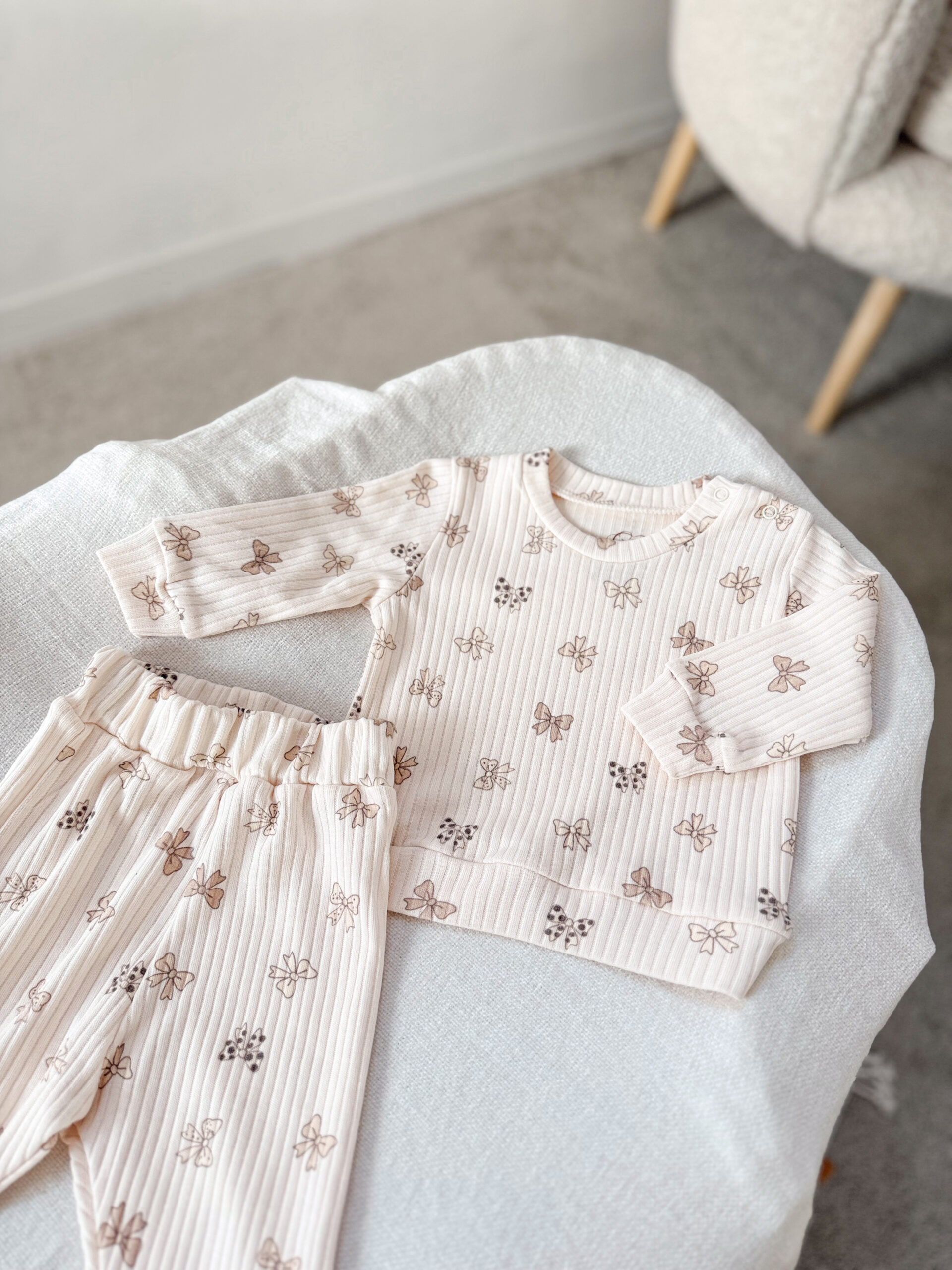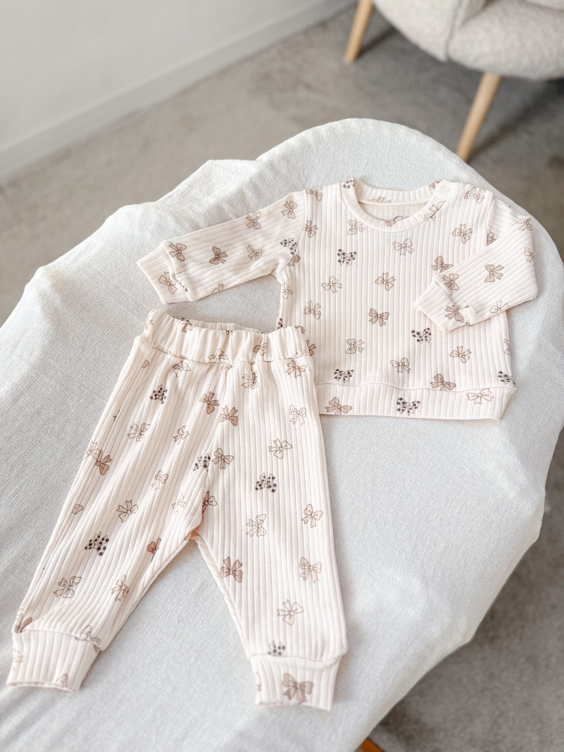 Rebrasti pamuk prijatan je za nošenje i nežan prema osetljivoj bebinoj koži, dok diskretan dezen sa mašnicama daje romantičan i bezvremenski izgled.