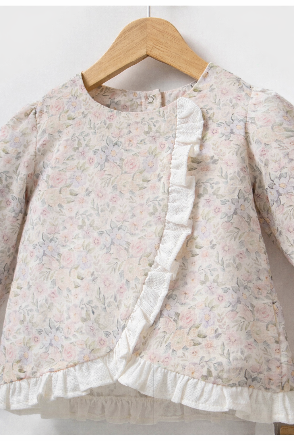 Nežan i poseban komplet za devojčice koji spaja udobnost i eleganciju u svakodnevnom stilu. Gornji deo sa romantičnim cvetnim dezenom i diskretnim volan detaljima kopča se napred, što olakšava oblačenje i daje dodatnu praktičnost.