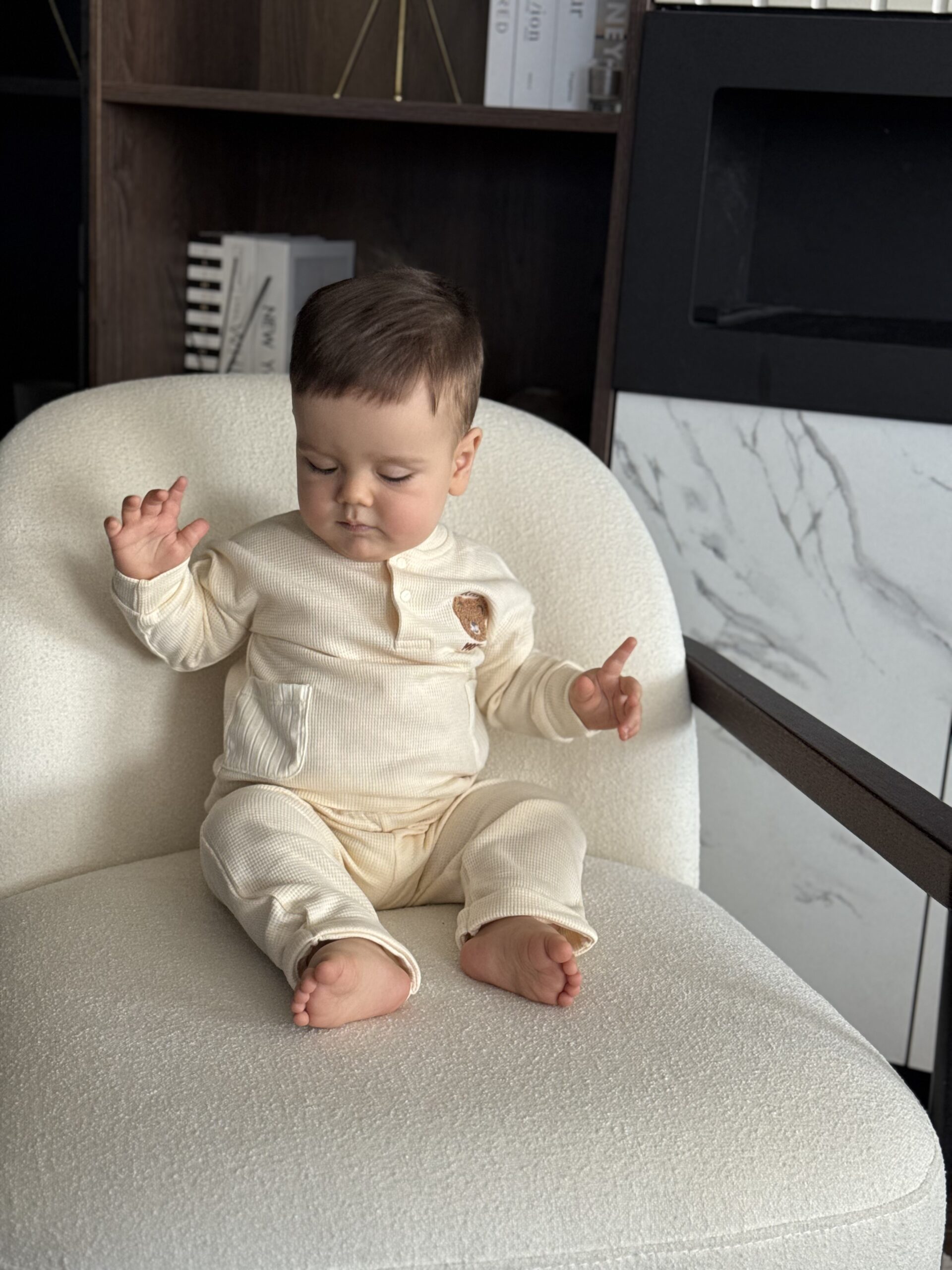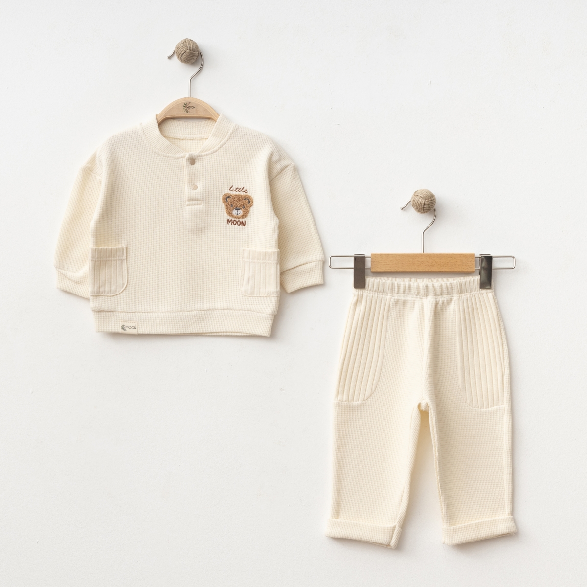 Set čine duks sa kopčanjem i dekorativnim motivom i udobne pantalone sa elastičnim pojasom.