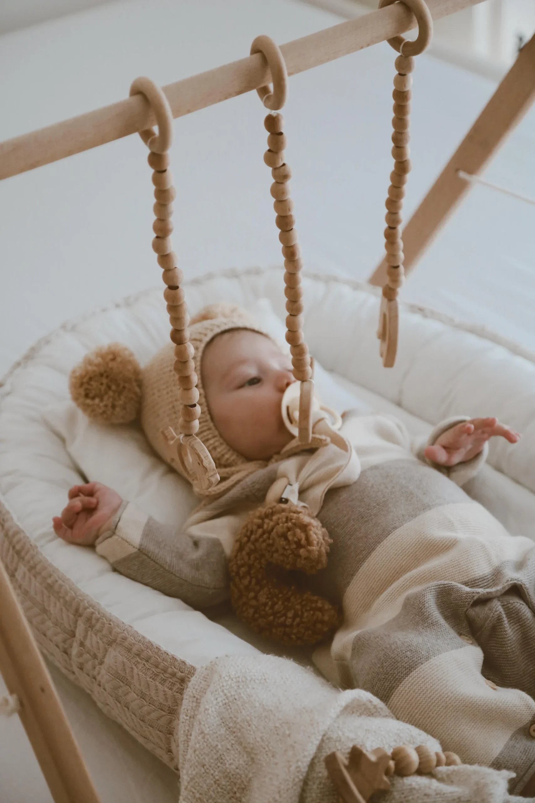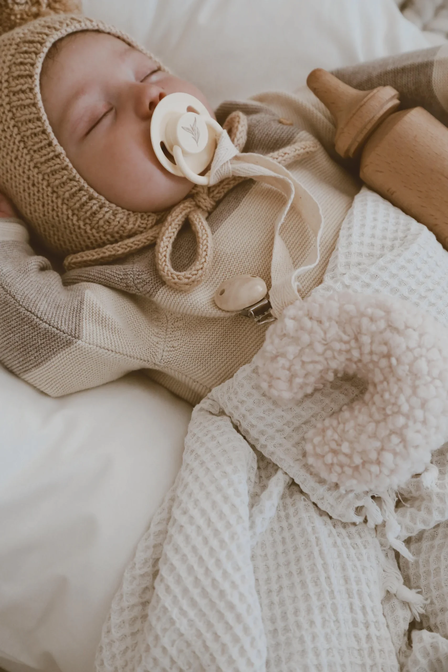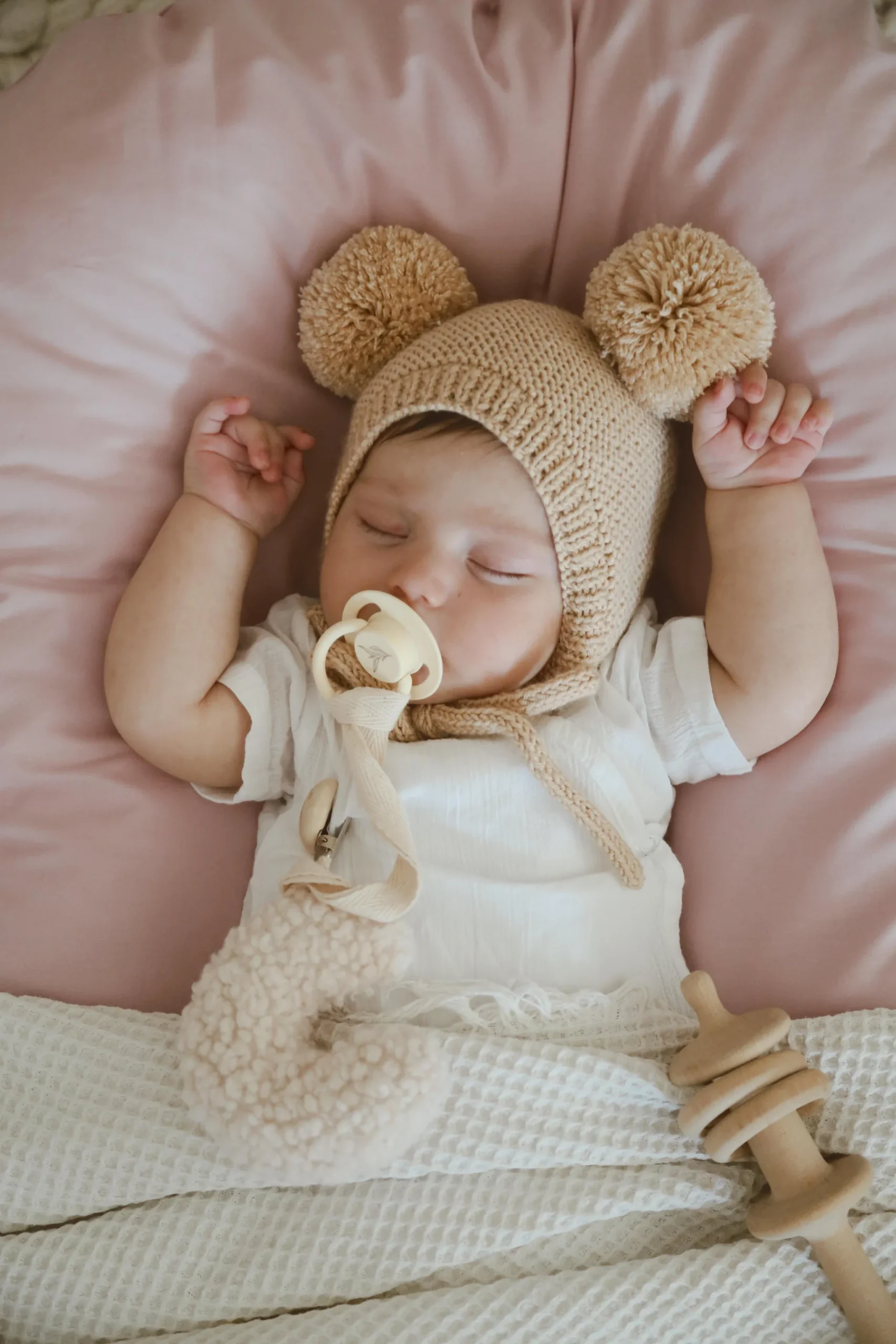 Pletena kapica na vezivanje namenjena je bebama u prvim mesecima, pružajući toplinu i udobnost uz nežno prijanjanje.